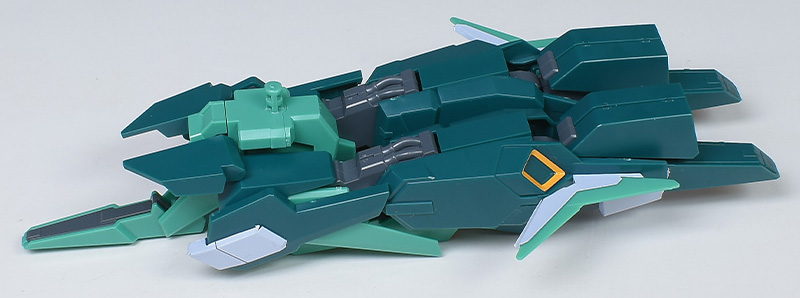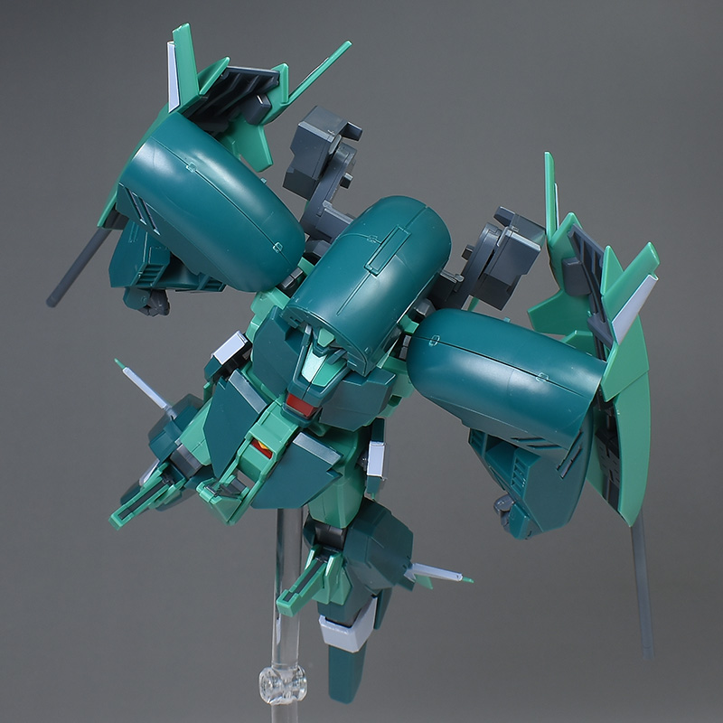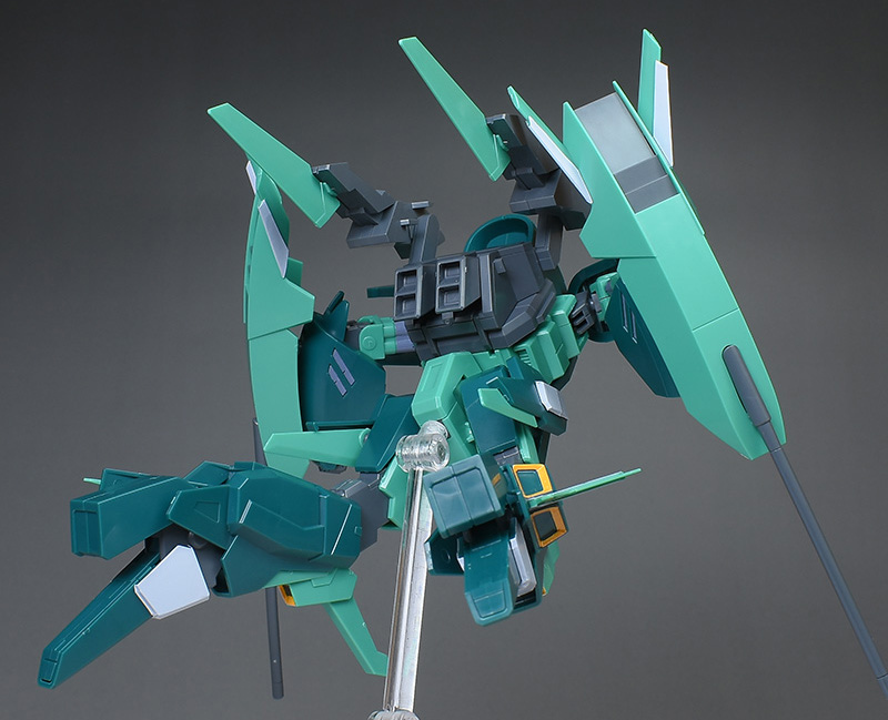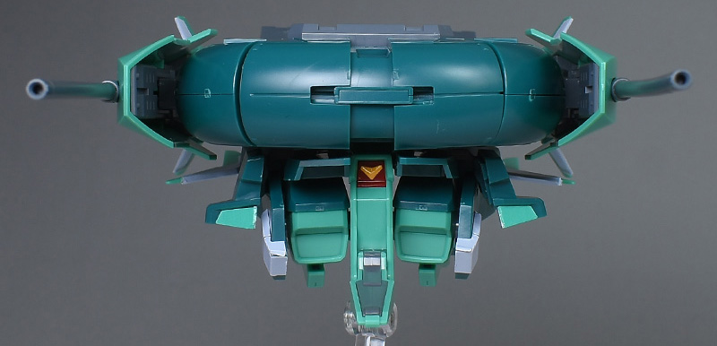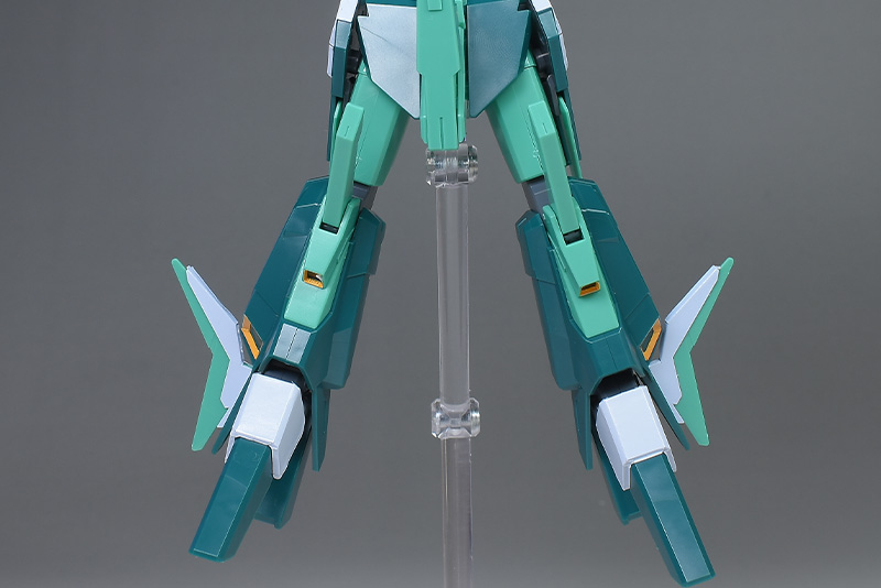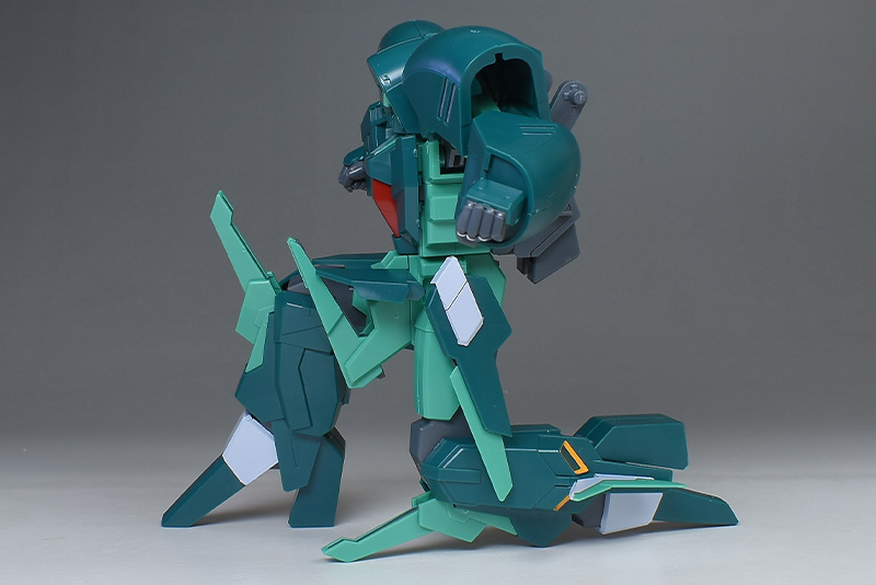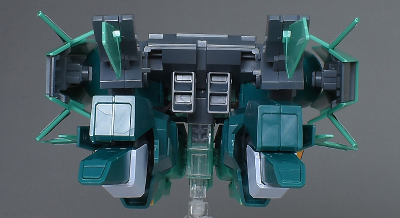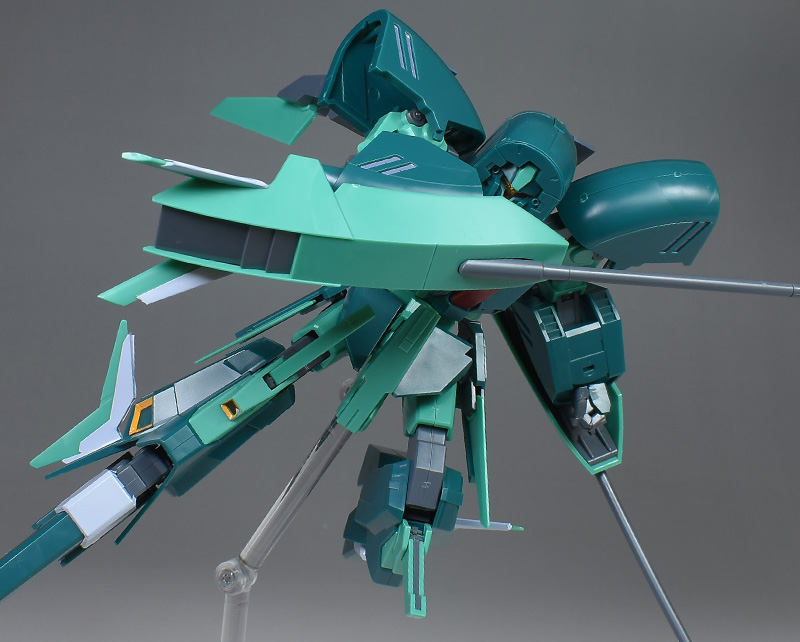 後部にはMA形態時に尾翼となる左右ウイングバインダー、中央にはコンパクトなスラスターを装備。アッシマーとは異なり、どことなくサブフライトシステム兼用を意識させるデザインで造形されています。