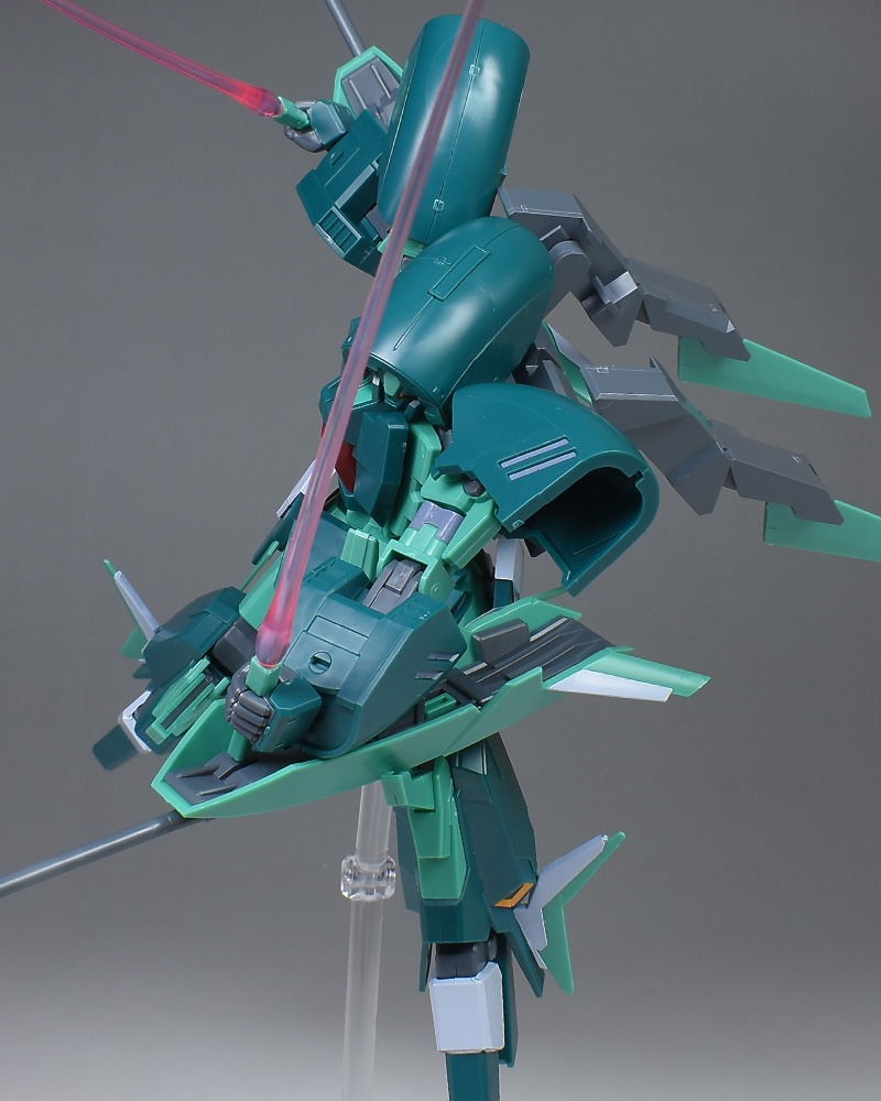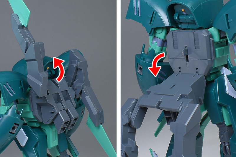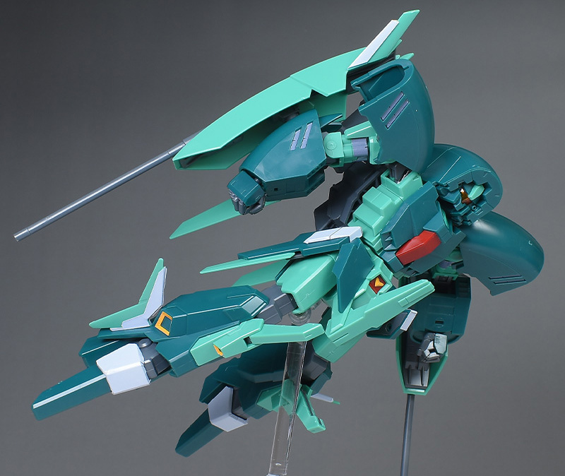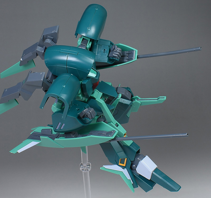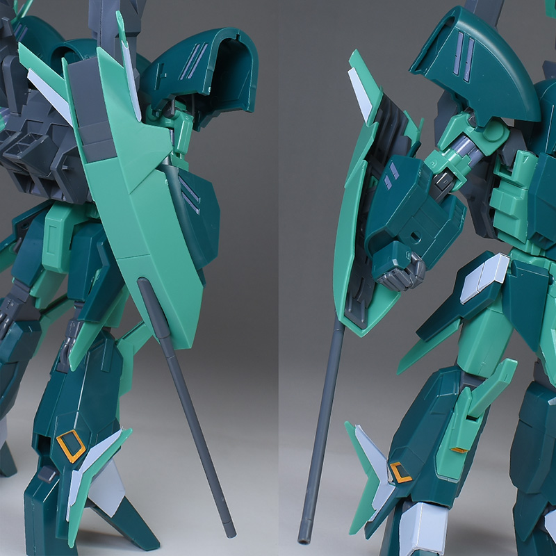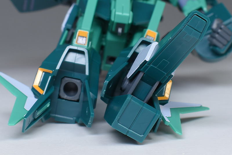 後部にはMA形態時に尾翼となる左右ウイングバインダー、中央にはコンパクトなスラスターを装備。アッシマーとは異なり、どことなくサブフライトシステム兼用を意識させるデザインで造形されています。