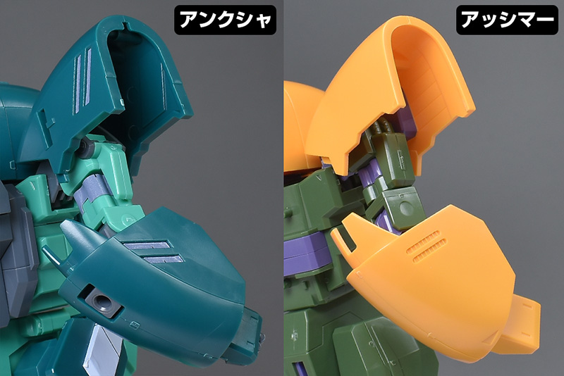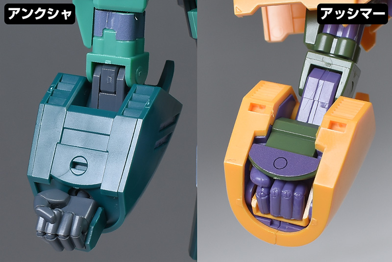 腕部をアッシマーと比較して。デザインは殆ど同じです。MA時に円形フォルムを形成するための半円柱装甲が肩部と前腕部に造形。ボリューム感ある容姿が再現されています。前腕のグレースリットモールドはシールでの色分け。