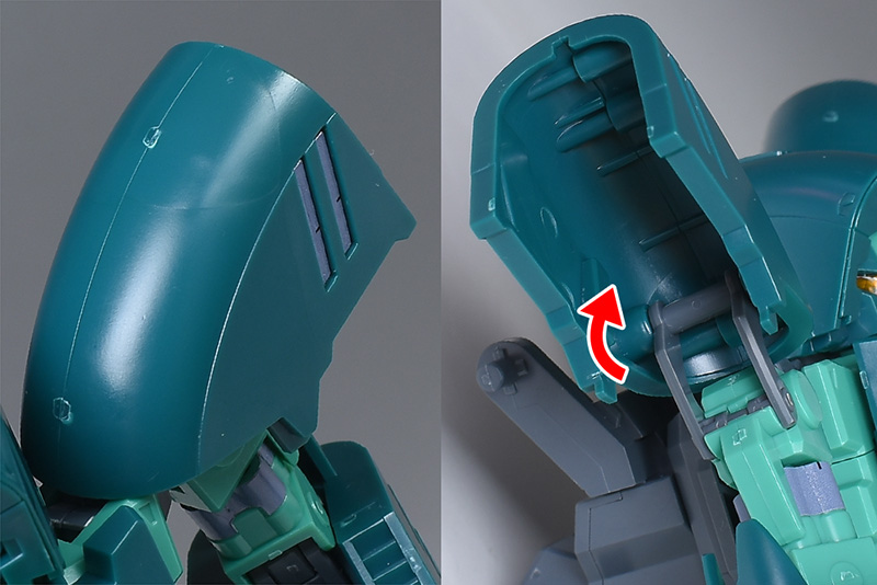 アッシマーと同様、頭部装甲は前後にスライド可能。アッシマーは内部が赤でしたが、こちらはグリーンで統一されています。