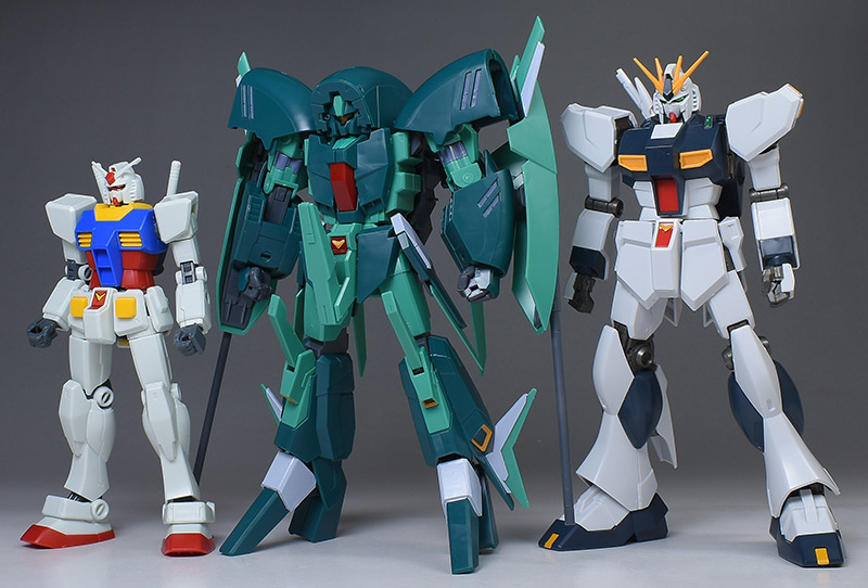 HGUC RX-78-2ガンダム(リバイブ版)、HGUC νガンダム(ファンネルなし)と並べて大きさを確認。νガンダムよりも大型でボリューム感があります。HGとしてはなかなかの大型キット。アンクシャの全高は22.3mです。