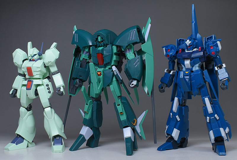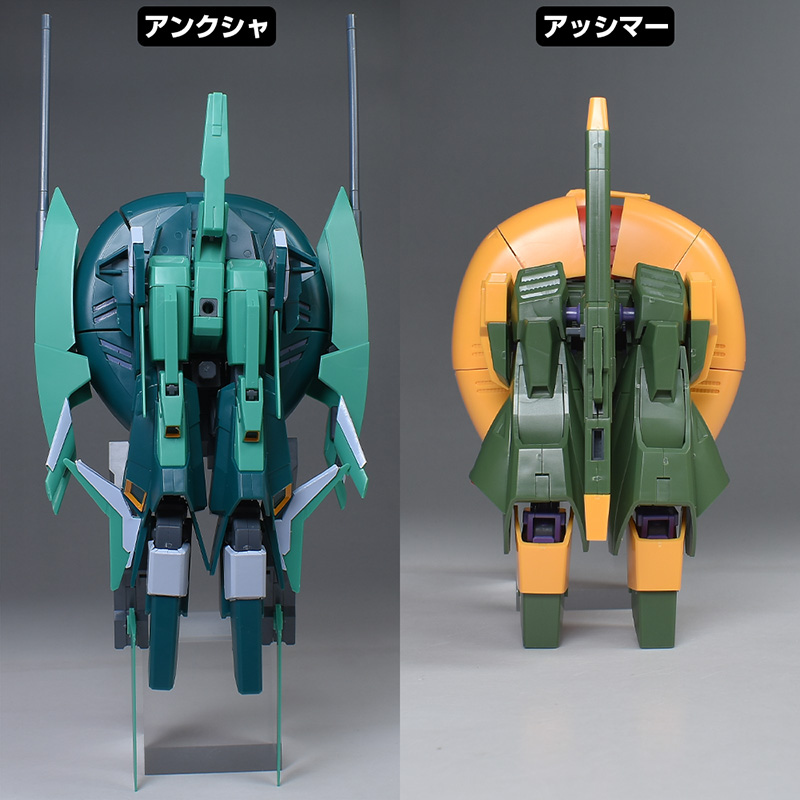 HGUCアッシマーのMA形態と並べて。脚部が細身になり、MS形態と同様、後部ウイングバインダーや左右のムーバブル・シールド・バインダーによって洗練されたデザイン、シルエットになっています。