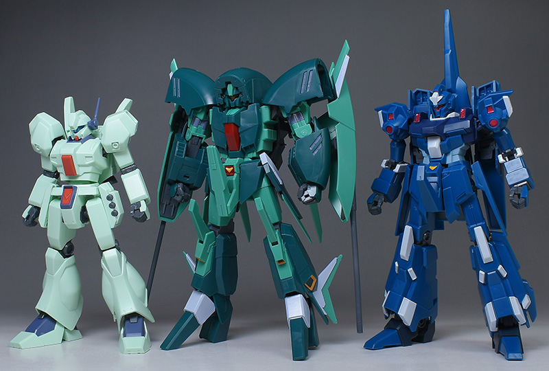 HGUC ジェガンHGUC リゼルと並べて。どちらかというとリゼルに近いですが、シルエットはかなり違っています。
