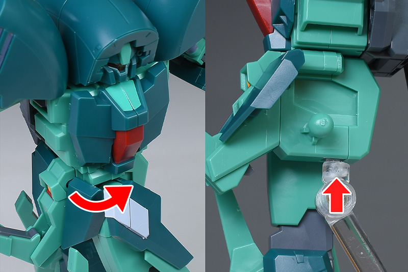 上半身は胸部装甲を展開し、腰にMA形態用のジョイントパーツを組み付けます。中央の赤い装甲も取り外しておきます。