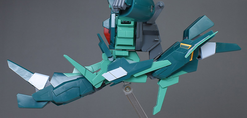 大腿部側面の装甲はボールジョイント接続で柔軟に可動。ライトグリーンのウイングも上下に可動します。