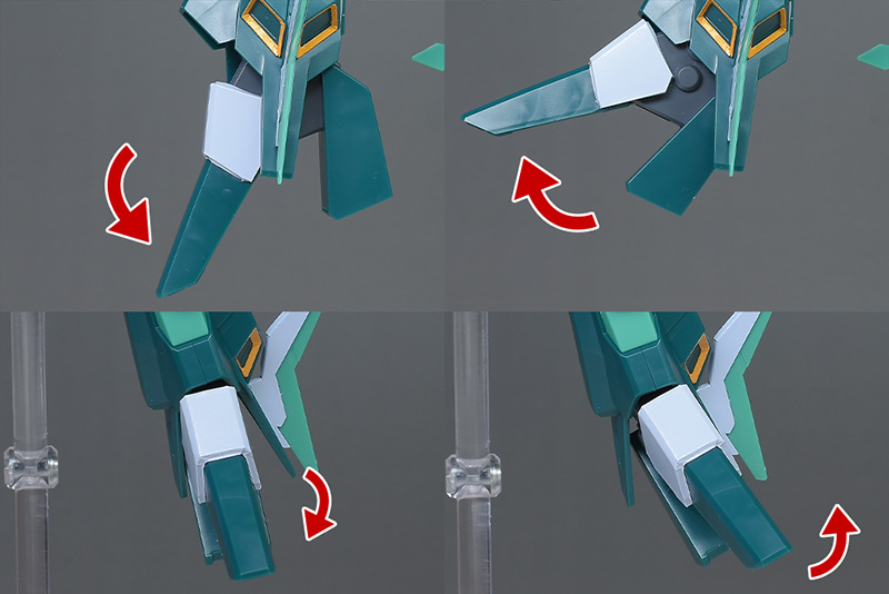 膝装甲(ニークラッシャー)や腰部中央の装甲はMA形態用に収納可能。ニークラッシャー内部にサーベル柄が収納されている設定ですが、特に脱着ギミックはありません。