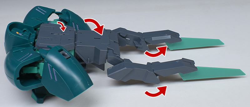 下半身は脚部を後方に展開してつま先を伸ばします。そしてフロントアーマーと腰部中央の装甲を展開。膝の装甲も閉じ、サイドアーマーのウイングも開いておきます。