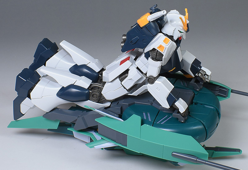 アッシマー譲りの変形機構は相変わらず秀逸でラクに可変ができますし、サブフライトシステム機能まで楽しめるというおまけ付き。ムーバブル・シールド・バインダーなどの装備により、MA形態でディスプレイさせるとスピード感が出ます。MS形態、MA形態共に完成度が高く、可変MSのならではの魅力が詰まったキットになっているのが良いですね。