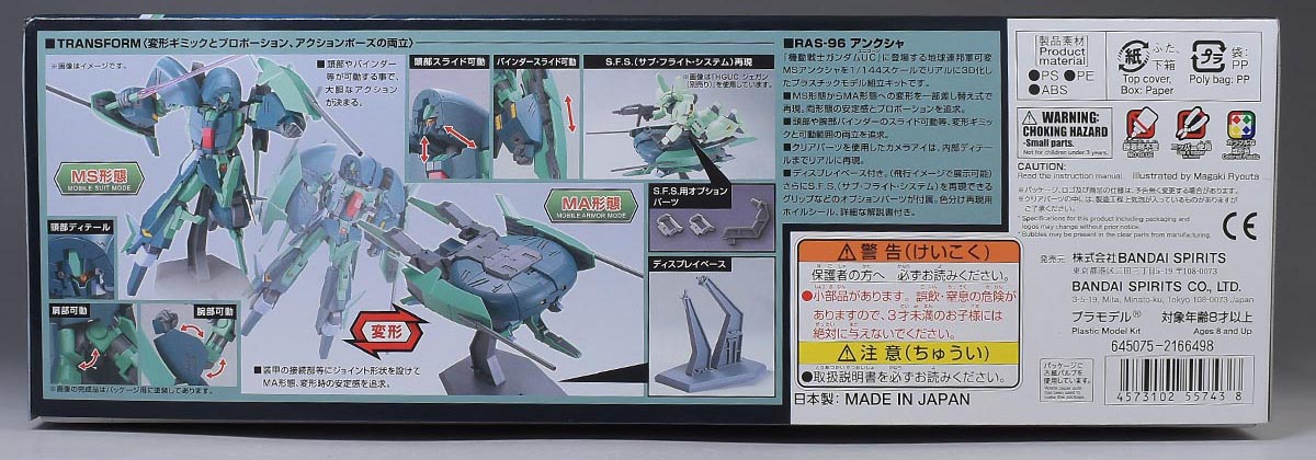 横絵はアンクシャの素立ち画像や変形によるMS形態とMA形態、付属品、各部ディテールや可動ギミックのほか、サブ・フライト・システムとしても機能する旨が掲載されています。変形ができて積載もできるMSは多くはないのでなかなか魅力的。他だとゼータと・・・・リゼル、デルタプラス・・・?