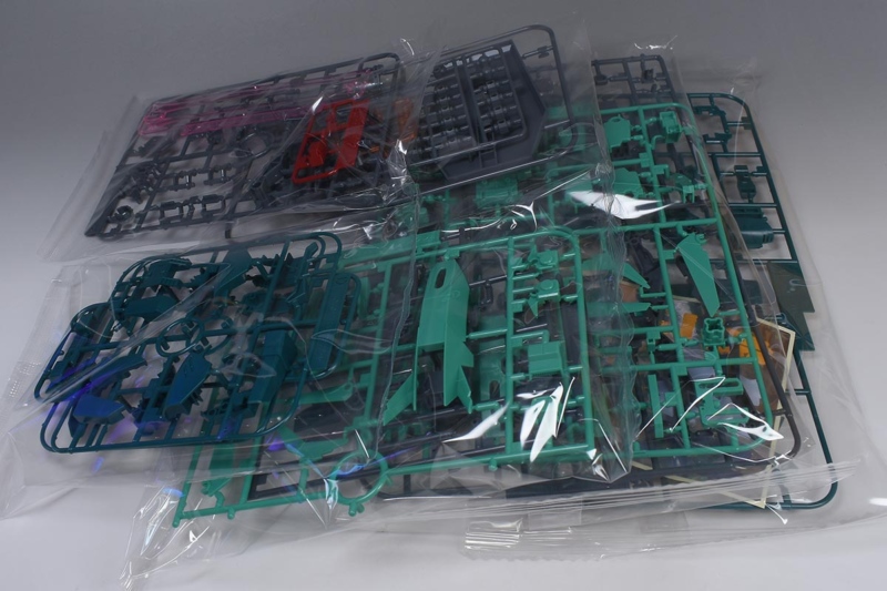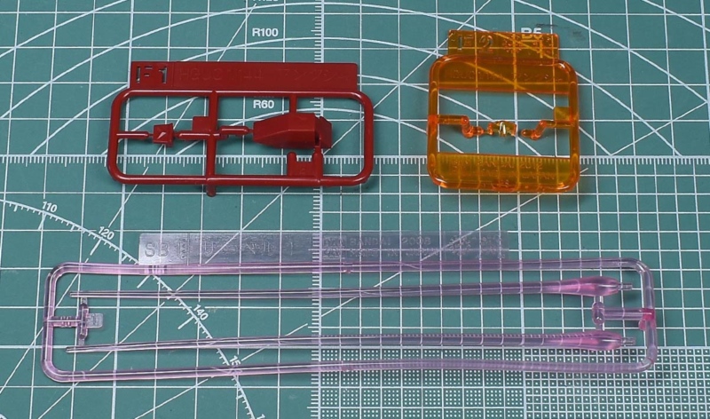 ↑F1、F2、SB1ランナー。F1はレッド成形色で、胸部や腰部パーツ。F2はクリアオレンジのバイザーパーツ。SB1はクリアピンクのビーム・サーベル刃。