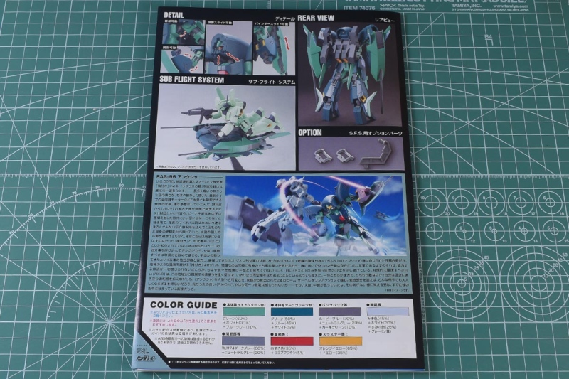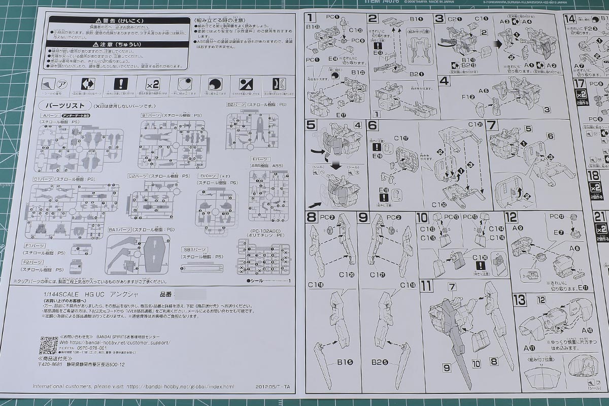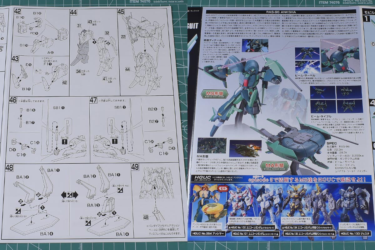 説明書は一般的なHGUCと同じ大判B5サイズ。表紙には塗装済みのアンクシャげ掲載されています。細部はシールでの色分けで色が足りない部分もあるので、塗装する場合はとても参考になります。それと後半に変形方法があるからか、前半の組み立て方法が詰め詰めで記載されているのがなんとも・・・。