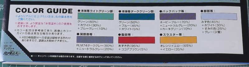 カラーガイド。色種、調色共にまずまずです。細部をシールで色分けするため、全体的に塗装する場合はマスキングが必須。特にダクトは内部やふちをそれぞれ塗り分けるため、少し手間がかかりそうです。