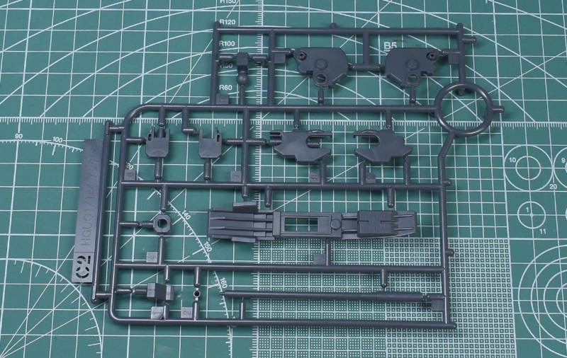 ↑C1、C2ランナー。グレー成形色で、胴体部や腕部、脚部の内部・関節パーツ、背部バックパックやウイングバインダーパーツ、ムーバブル・シールド・バインダーパーツなど。