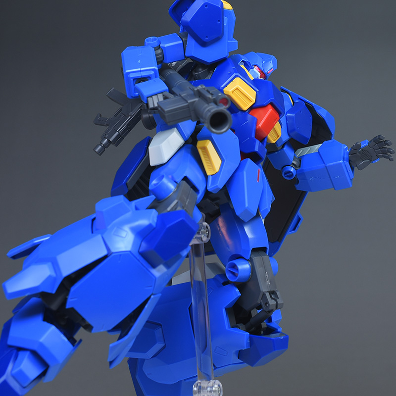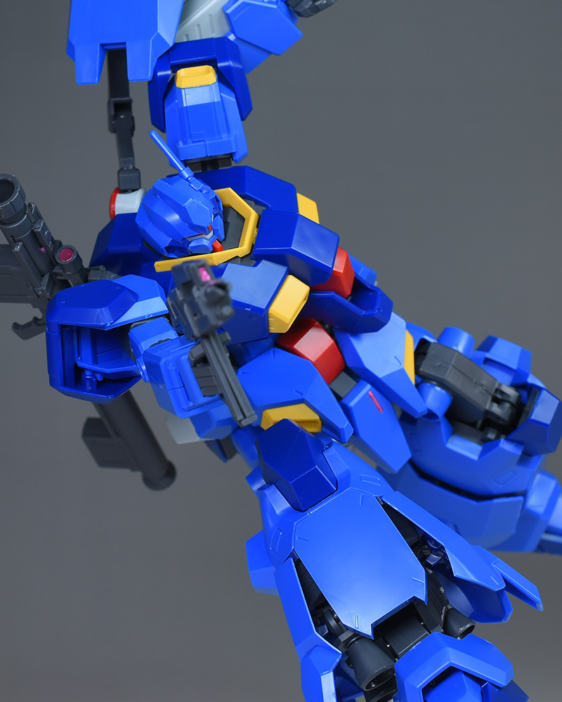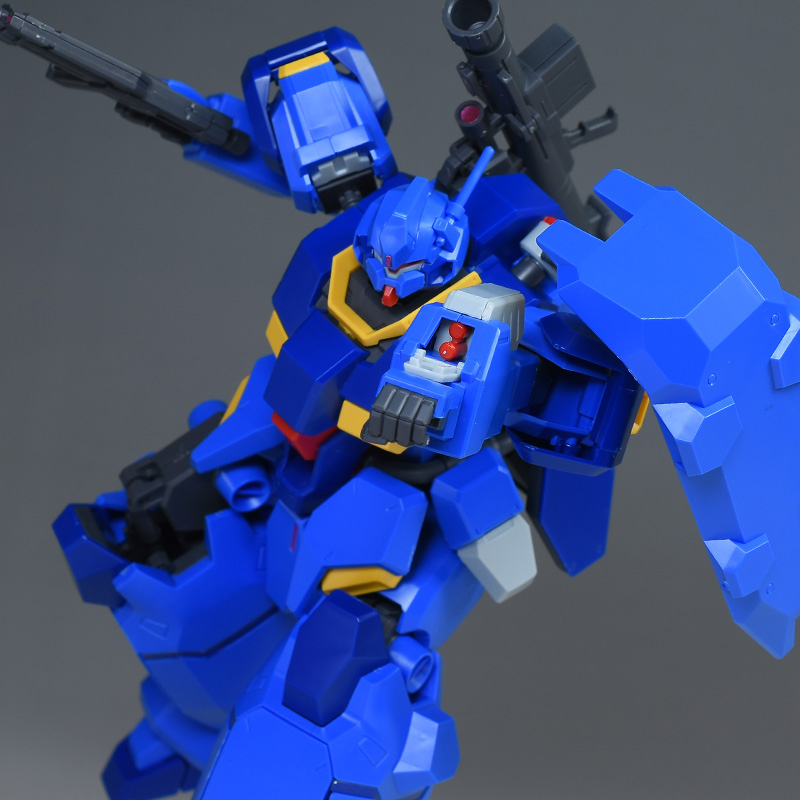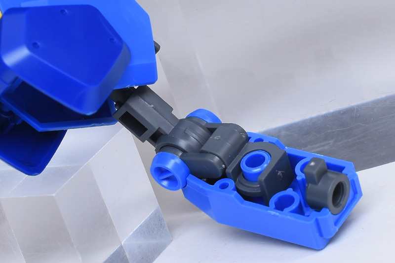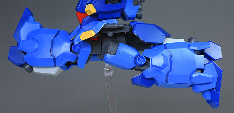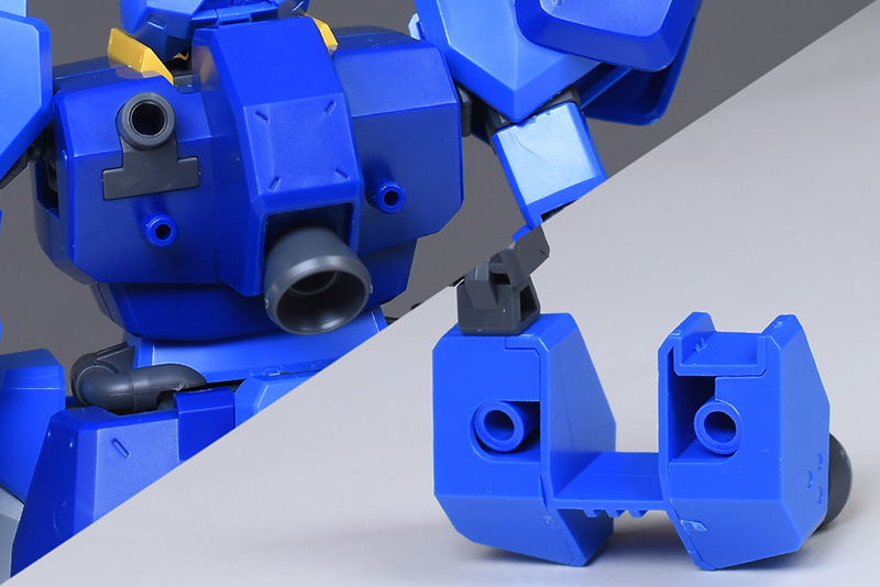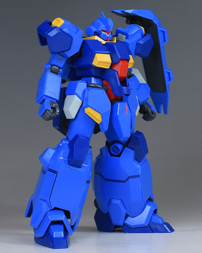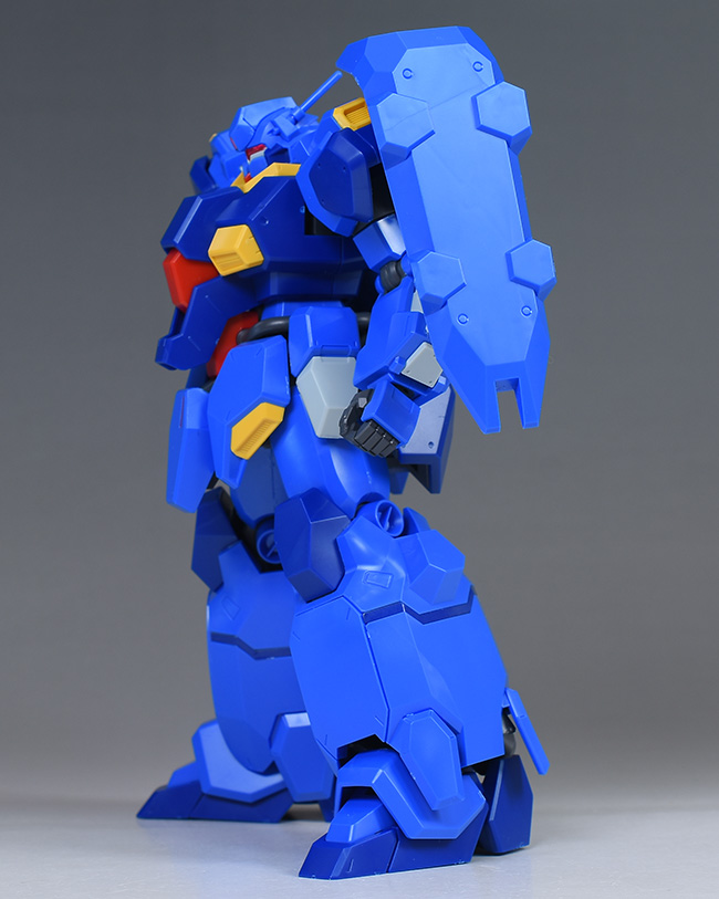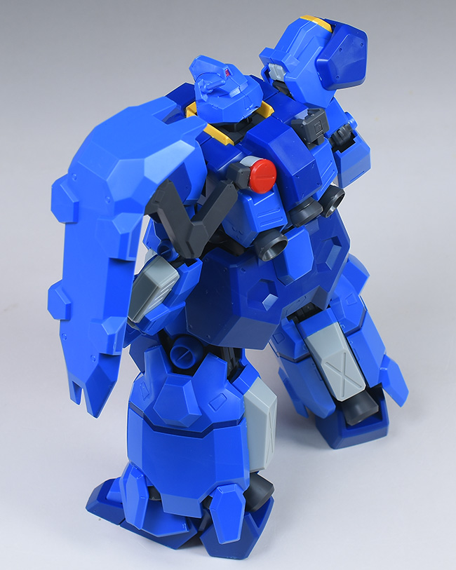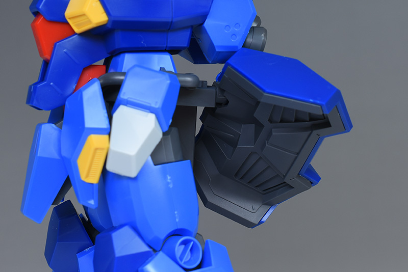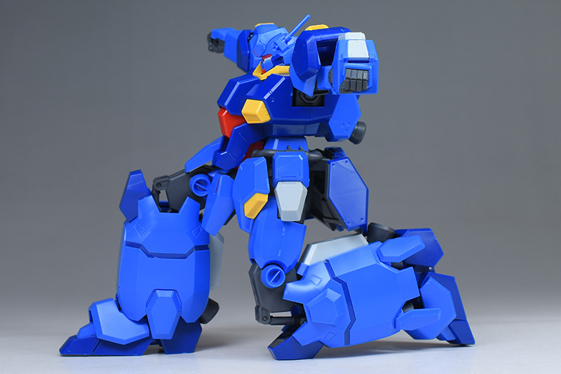 成形色はブルーと濃いめのブルーを基調に、胴体部や肩部にイエロー、頭部や腹部、バックパックにレッドを配色。その他、前腕グレネード・ランチャー、サイドアーマー、脚部の一部装甲がライトグレー、内部や関節、武装類がダークグレー成形色での再現となっています。