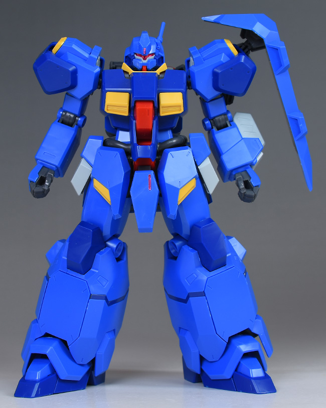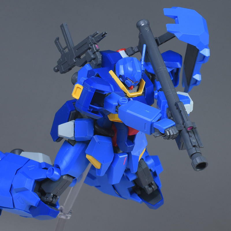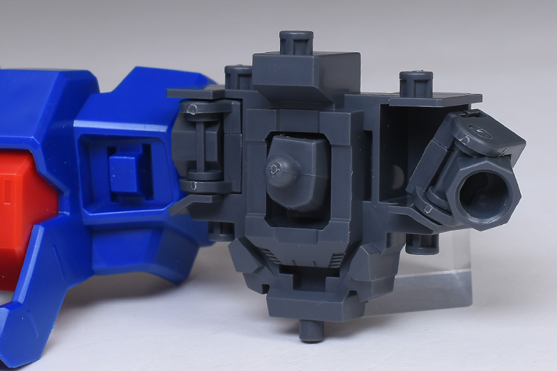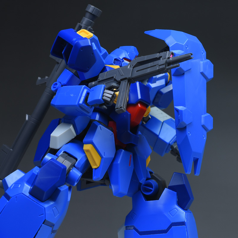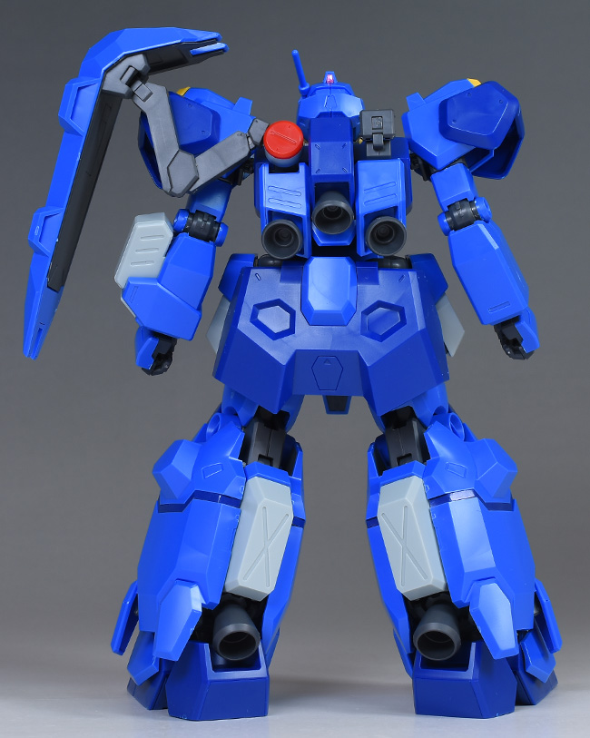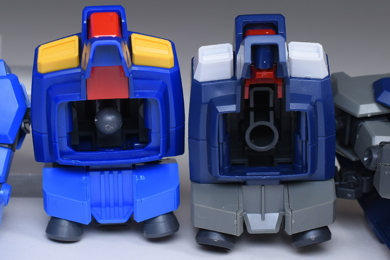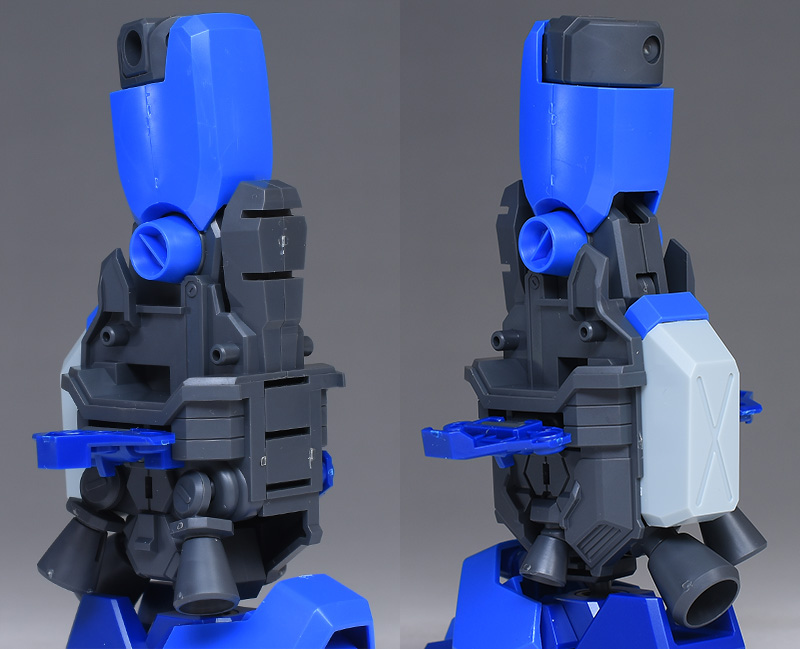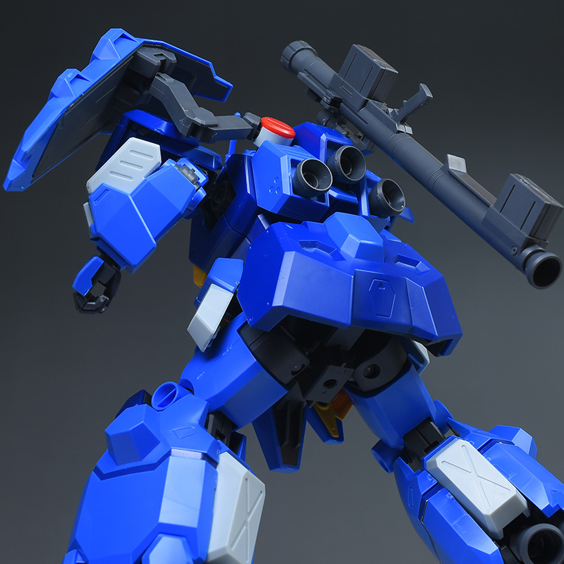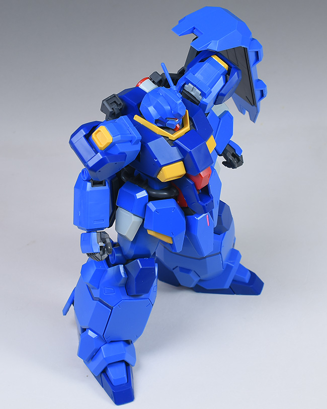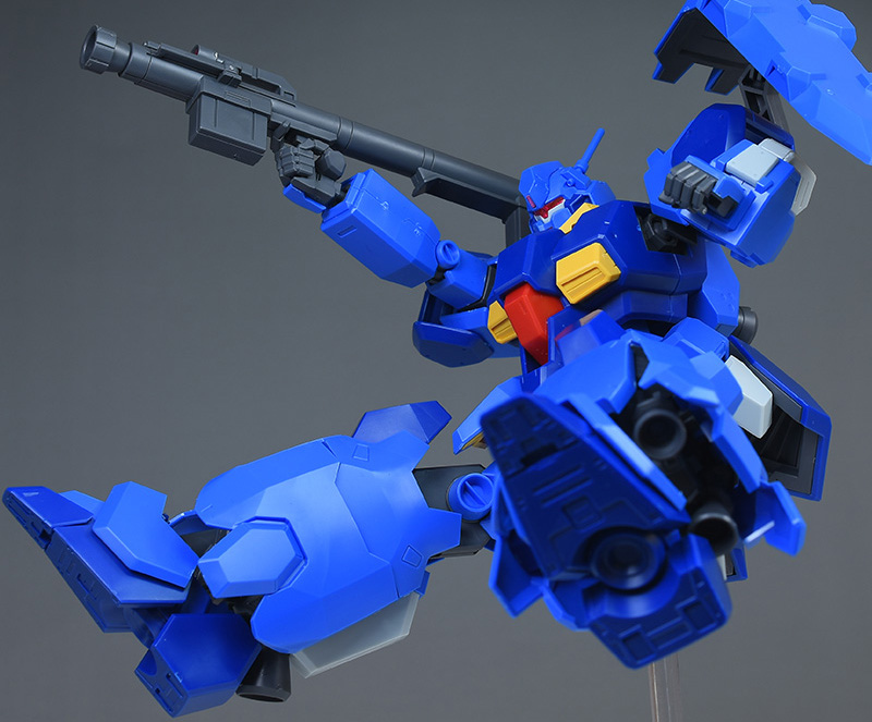 成形色はブルーと濃いめのブルーを基調に、胴体部や肩部にイエロー、頭部や腹部、バックパックにレッドを配色。その他、前腕グレネード・ランチャー、サイドアーマー、脚部の一部装甲がライトグレー、内部や関節、武装類がダークグレー成形色での再現となっています。