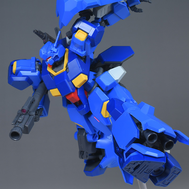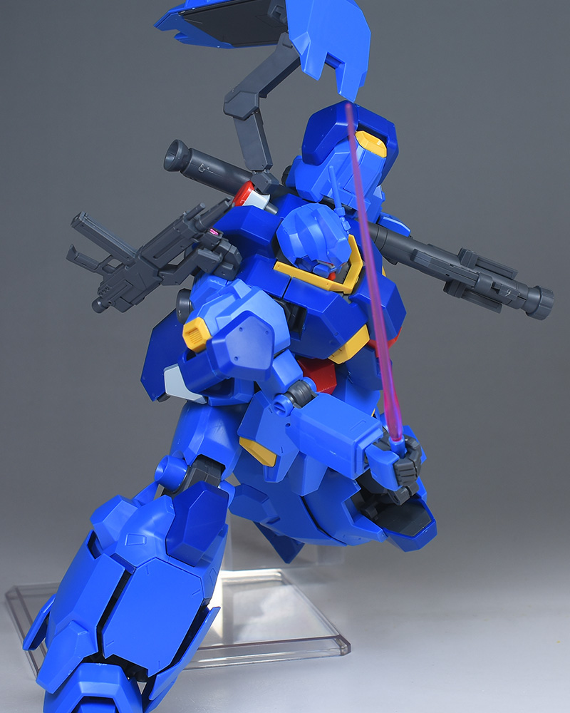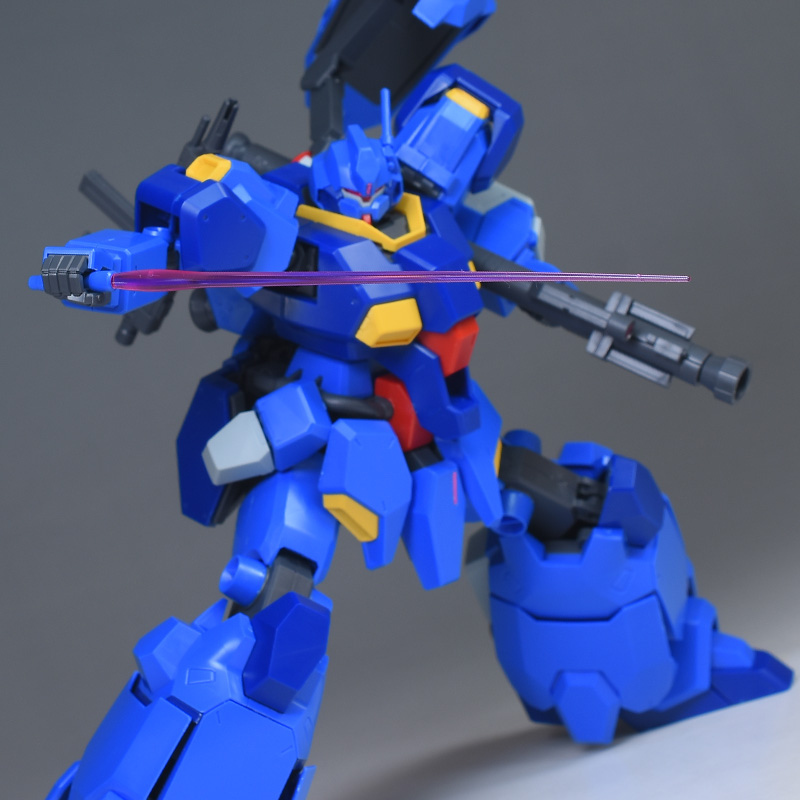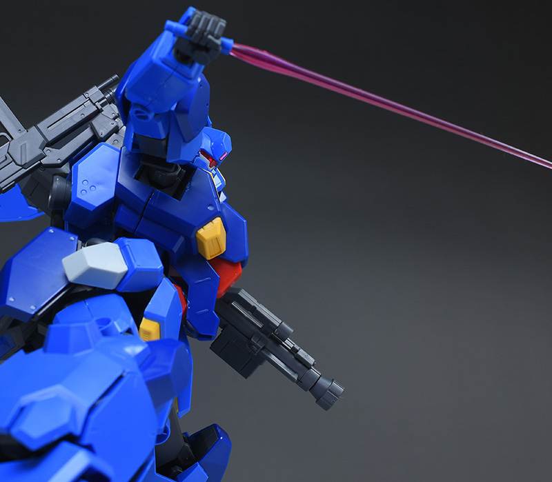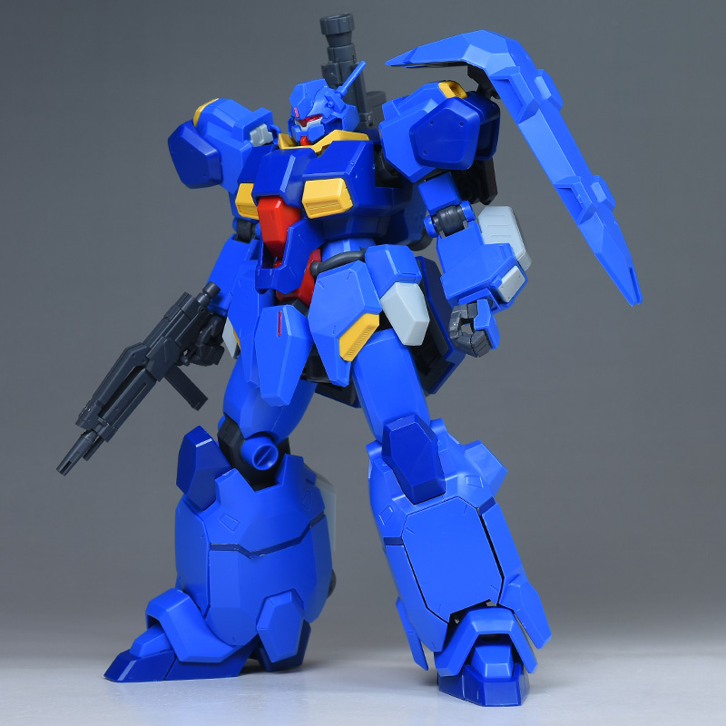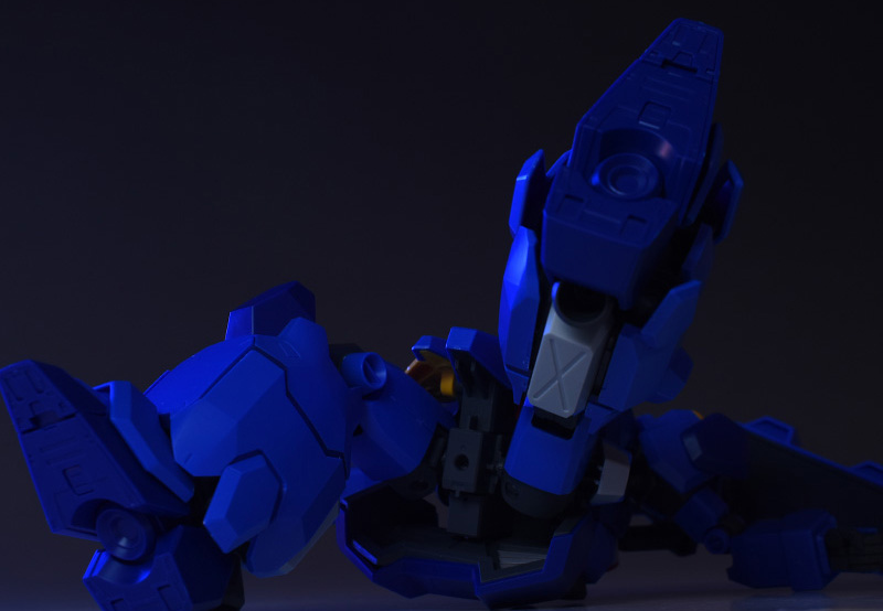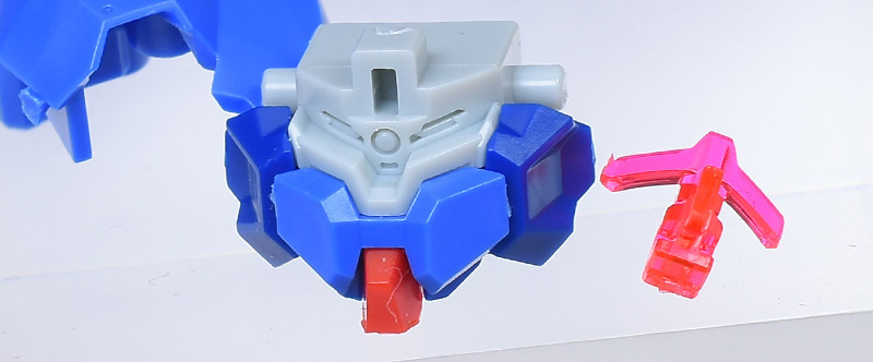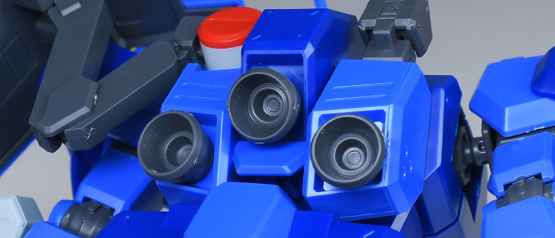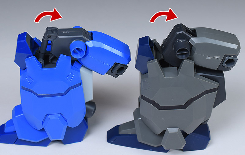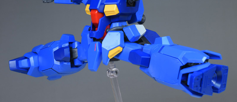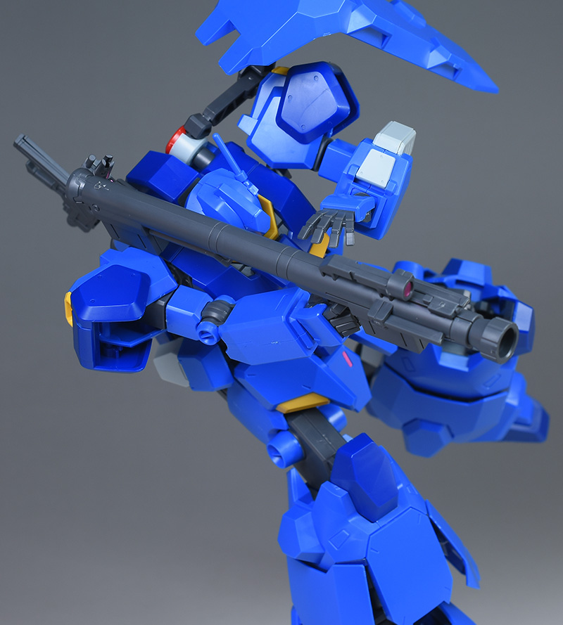 成形色はブルーと濃いめのブルーを基調に、胴体部や肩部にイエロー、頭部や腹部、バックパックにレッドを配色。その他、前腕グレネード・ランチャー、サイドアーマー、脚部の一部装甲がライトグレー、内部や関節、武装類がダークグレー成形色での再現となっています。