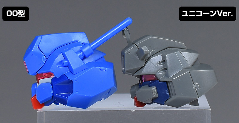 頭部をユニコーンVer.と並べて比較。デザインは似ていますが、全体が00型用に新造。装甲にまとまりが出ている他、きりっとしたフェイスに変化しています。その他では、額のアンテナがオミットされ、変わりに左側頭部にロッドアンテナが追加。アンテナ基部のバルカンも2門から1門になっています。