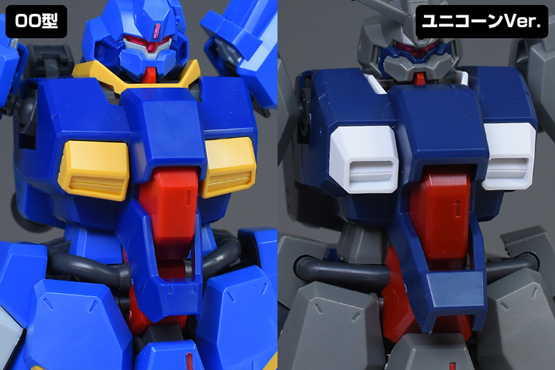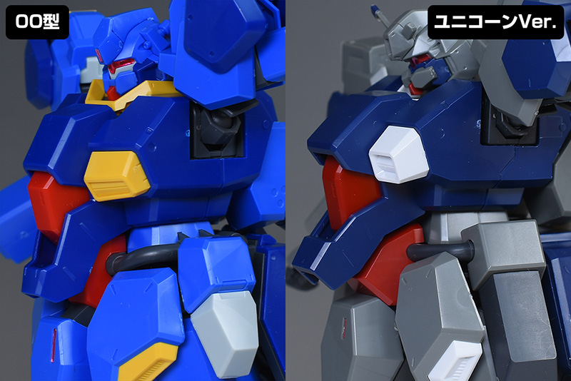 胸部・腹部をユニコーンVer.比較して。一見すると殆ど同じように見えますが、外装、内装、エアインテークに至るまで各部が00型用に新造。やや細身でスタイリッシュなシルエットに変化しています。