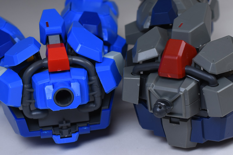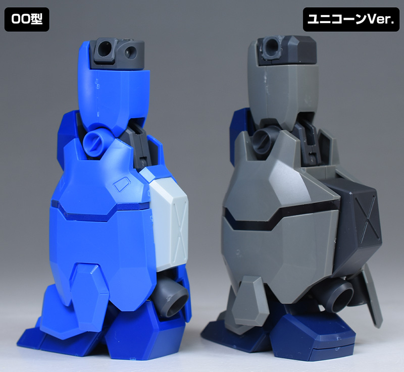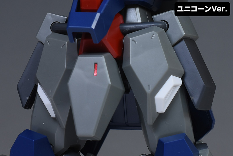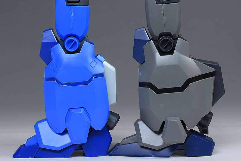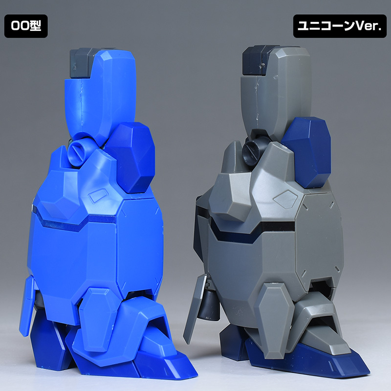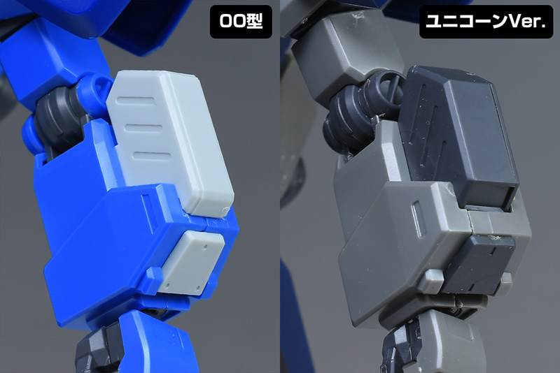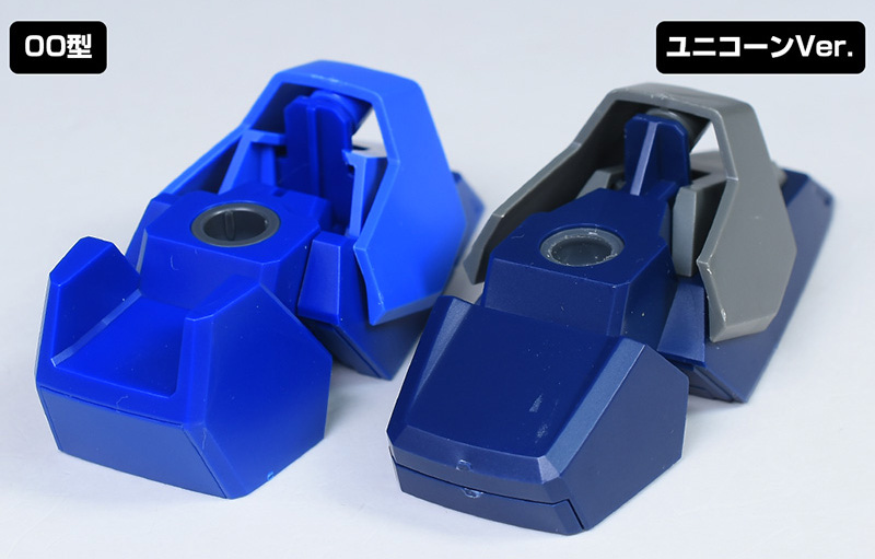 脚部をユニコーンVer.と並べて。ここもユニコーンVer.と似たデザインですが、機構や構造は全くの別物。全体が00型用に新造され、よく見ると各部のパーツ形状が細かく違っています。