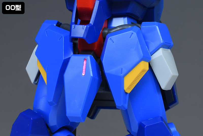 膝にはユニコーンVer.由来のスライドギミックがあり、膝を伸ばすことでより深くまで曲げられるようになっています。ただし00型は膝を曲げるとシリンダーシャフトが露出する仕様になって新鮮味があります。この狭い領域にMGを思わせるディテールが施されているのがスゴイですね。