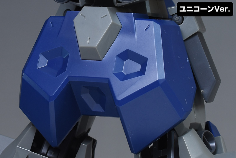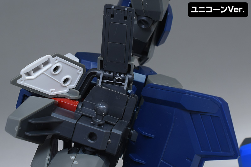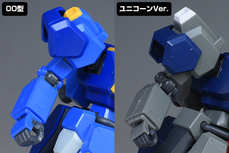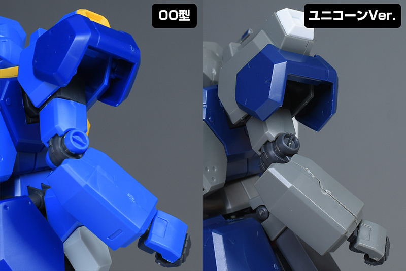 腕部をユニコーンVer.と比較して。形状自体はよく似ていますが、ショルダーアーマーが少し丸みのある装甲に変化し、一回りほど小型化するなど可動性能の向上を感じさせる造りになっています。表面モールドもライン型から丸型に変化。上腕以下は一部がユニコーンVer.からの流用となっています。