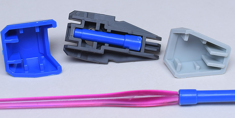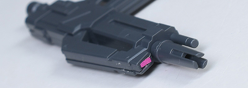 本体部分は左右の組み合わせですが、上下の合わせ目は段落ちモールド化。銃口上部のセンサーはピンクのシールでの色分けです。
