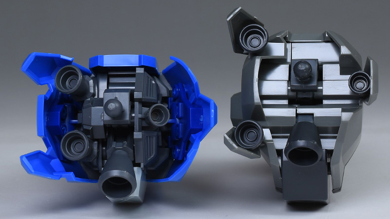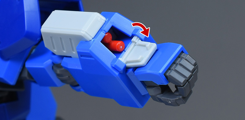 グレネードランチャーは手前のハッチを開くことで2基の弾頭が露出。弾頭周りはグレーなどに塗り分けが必要です。弾頭の脱着ギミックはないため、無改造で射出シーンを再現するのは難しいかと。