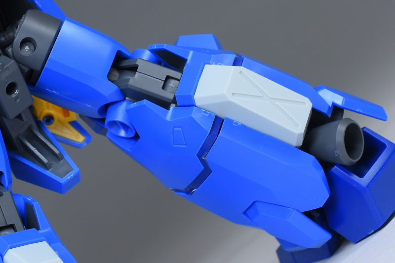 ショルダーアーマーは前後の組み合わせですが、合わせ目は端でモールド化。側面ダクトも黄色いパーツでの色分けで、内部にはスリットモールドがきっちりと入っています。あと、珍しいですが内側の白もパーツで細かく色分けされています。ダークブルーの装甲は少し上下に可動。