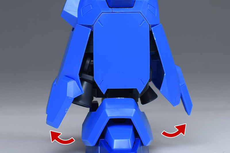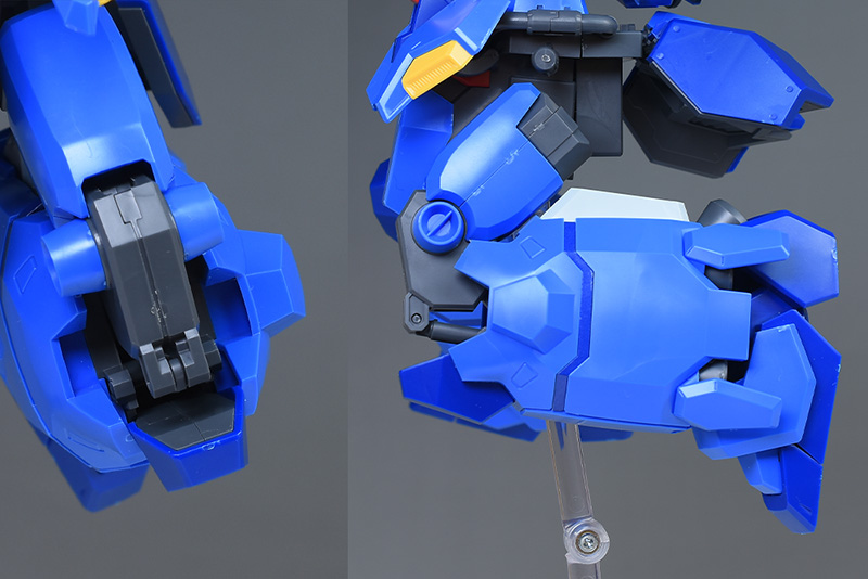 腹部がロールしますが、外装が干渉するため、45度程度と制限されています。浮かせてディスプレイさせる場合は一般的なHGと同様、股間部にアクションベースやスタンドの3.0mm軸を差し込みます。