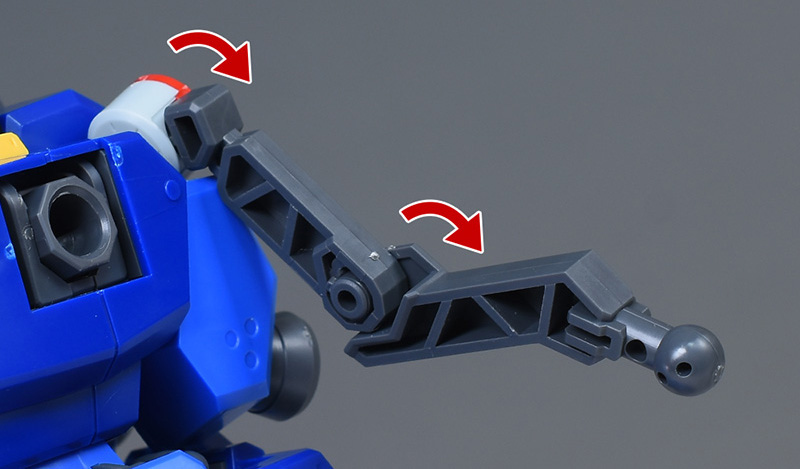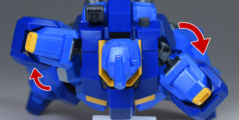 肩がギミックによって広めに可動するので、バズーカの両手持ちも問題なく再現できます。ただ、肩のギミックはパーツのかみ合わせがやや固めなので、上手く引っ張り出して展開してやる必要がありそうです。