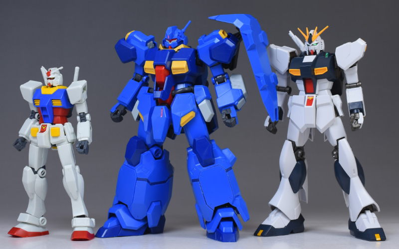 HGUC RX-78-2ガンダム(リバイブ版)、HGUCνガンダム(ファンネルなし)と並べて大きさを確認。ファンネルなしのνガンダムよりも少し大きめですが、肉厚なのでボリューム感があります。RX-78-2ガンダム2体分以上のディスプレイスペースが必要。ちなみにグスタフ・カールの頭頂高は22.0mです。