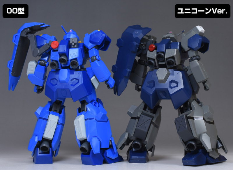 HGUCグスタフ・カール(ユニコーンVer.)と並べて。カラーリングはもちろん、各部形状だけでなくプロポーションも00型のほうがバランス良く造形されていますね。左肩のフレキシブル・シールドの向きも違っています。