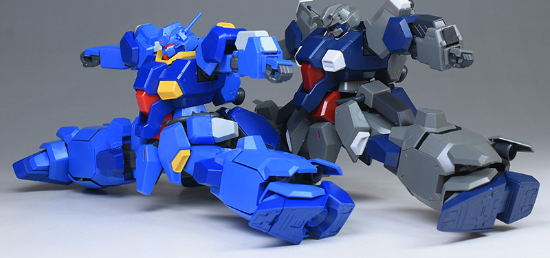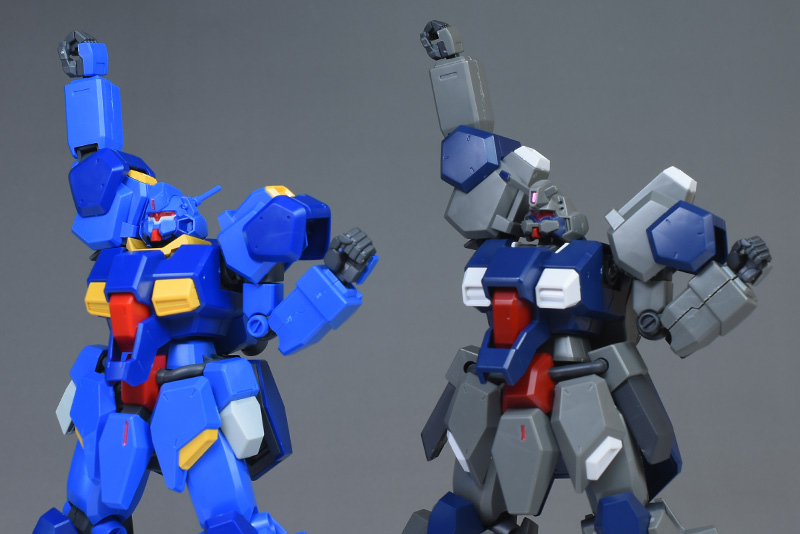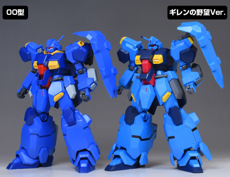 HGUCグスタフ・カール(ギレンの野望Ver.)とも並べて。どちらもブルーが基調でカラーリングが近いものがあります。ギレンの野望Ver.はシールド用のジョイントが新造されているため、向きが00型と同じになっています。