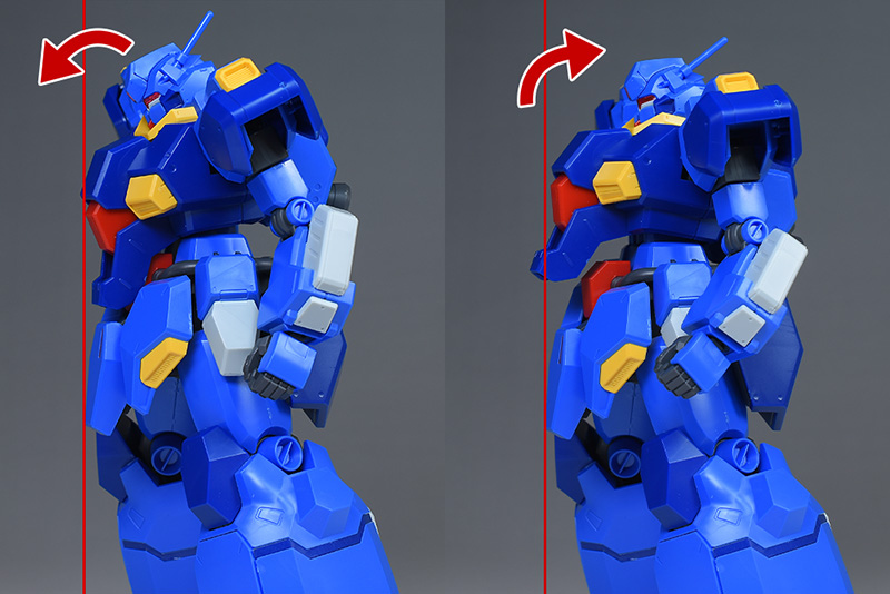 肩はボールジョイント接続で適度に前後します。前方へは肩の展開ギミックによって幅広くスイングさせることができます。