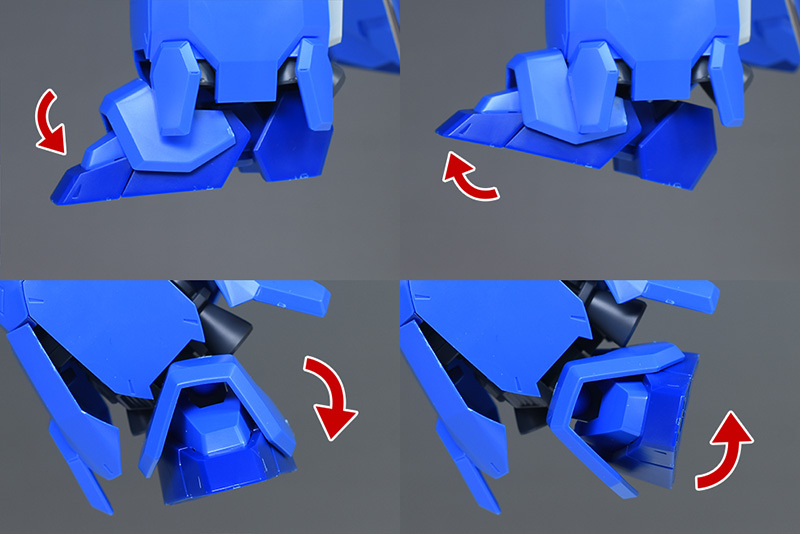 足首は少し前後する程度。左右へは脚部装甲やバーニアを展開することで広めにスイングします。