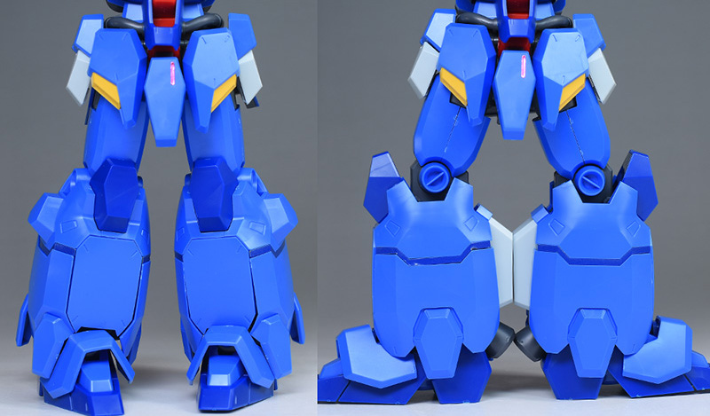 膝から下の部分にはメカニカルな内部フレームが造形。脹脛のブルーのラインモールドはシールで色分けしますが、内部パーツとの兼ね合いでパーツ分割されているため、塗り分けがラクです。この辺りの親切設計も塗装派にとってありがたいですね。