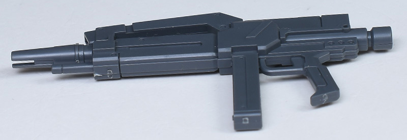 ビーム・ライフル。バーチカル方式のEパックを採用し、上部に複合センサーを持つビーム・ライフルです。設定ではジェガン(マンハンター仕様)と同タイプとのことですが、劇中ではジェガンはビーム・ライフルを装備していなかった気がします。ユニコーンVer.からの流用ではなく00型用に新造されたもので、各部に特徴的なモールドが造形されてミリタリー感が強くなっています。