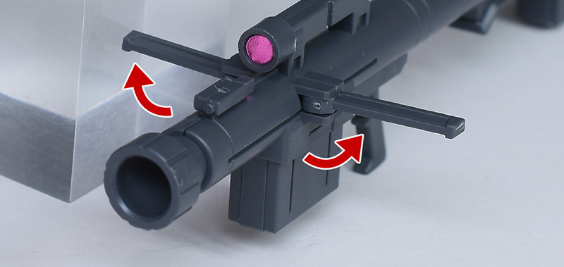 フォアグリップは左右に展開可能。センサー、砲口共に別パーツ化されているため、塗り分けたりすると映えそうです。センサーはピンクのシールでの色分け。