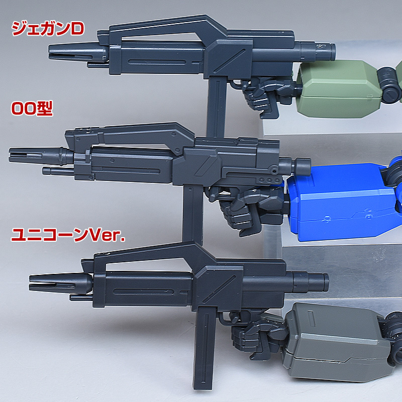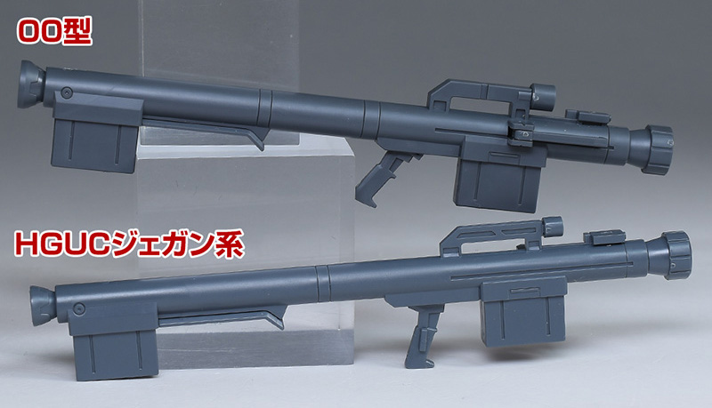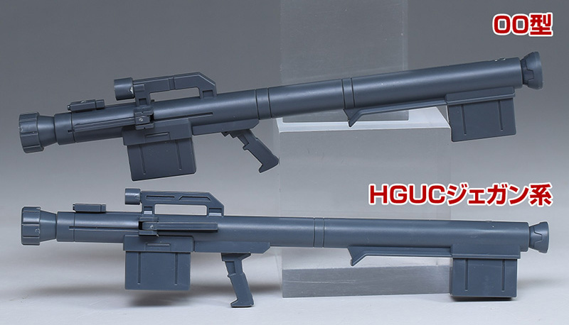 HGUCジェガン系に付属の汎用バズーカと並べて比較。デザインは似ていますが、この00型用に新造。フォアグリップが左側だけでなく左右に配されています。