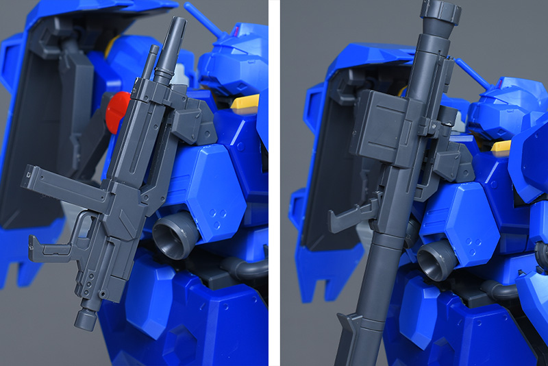 背部ラッチのパーツを組み替えることで、ビーム・ライフルとバズーカが懸架可能です。ジェガン用やユニコーンVer.などに付属しているものは溝がないのでマウント出来ないようでした。