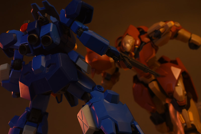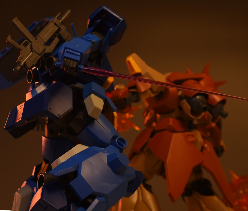 劇中で戦闘を繰り広げたHGUC メッサーF01型と並べて。大きさはほぼ同サイズ程度。どちらもしっかりと造り込まれているため、組み合わせてディスプレイさせるとより繊細なシーン演出ができそうです。それにしても、この巨体が地上でドカンドカンやられたらたまらないですね;