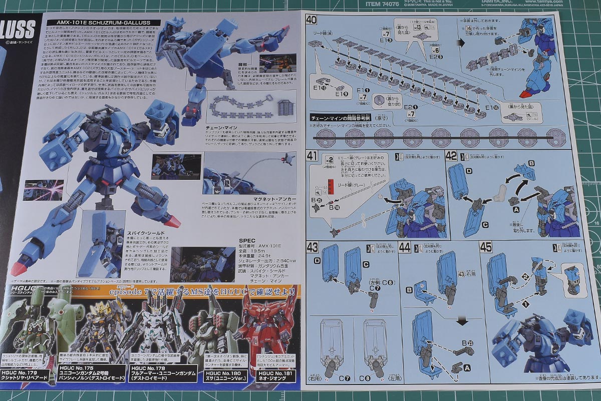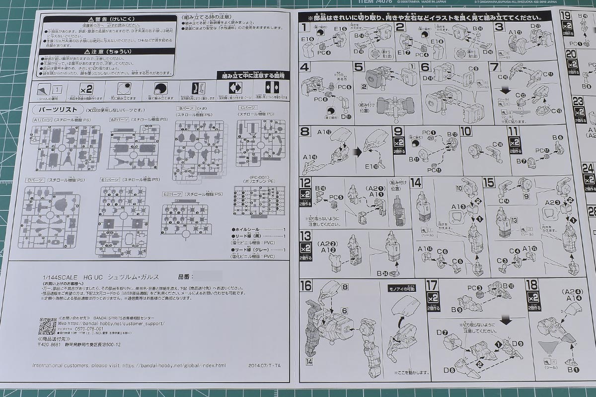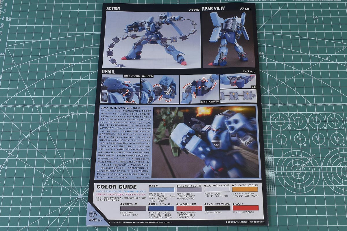 説明書は大判B5サイズ。HGUCなので表紙は塗装済みキットの見本画像になります。劇中ではズサがケンプファーのショットガンを装備していたり、あっけなく撃破されたギラ・ズールもジェガンのシールドを装備していました。何気によく見ると標準装備とは違ったものを装備しているのが面白いですね。