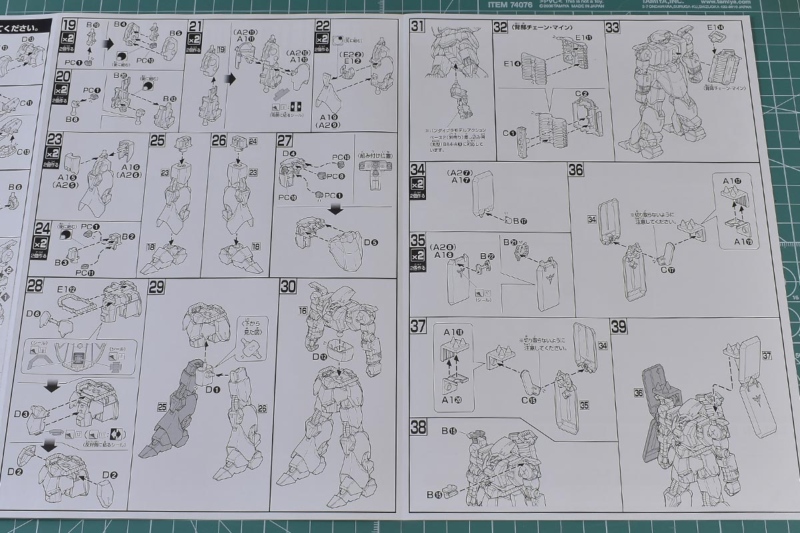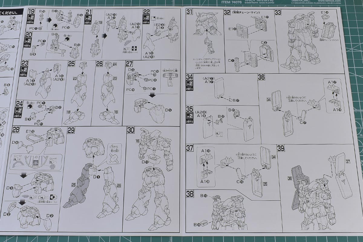 以上、説明書でした。多少ポリキャップを挟んでの2枚パーツ構成というシンプルな部分が多いですが、可動箇所が比較的多く、ポージングを意識した造りになっていると思います。ただ、ポリキャップ全盛期くらいのキットですが、PC-001は種類が多いこともあってPC-002によりも少し強度が弱く、ヘタれるのが早い気がします。スパイクシールドなども一部固定強度が甘いところがあるので、そのあたりは補強を考慮したほうが良いかと。