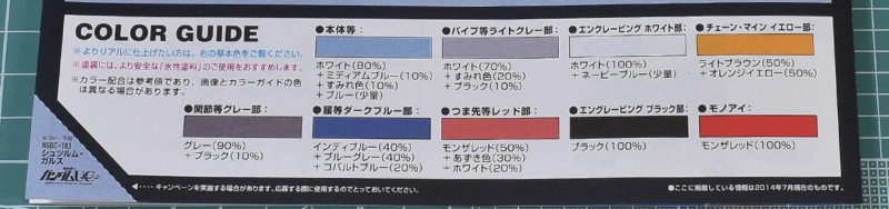カラーガイド。基本的な色味が多いですが、調色は複雑なものや簡単なものなど様々。塗装する場合、ホイルシールでの色分け箇所はマスキングが必要です。それと胸部エングレービングはモールドがないのでどうするかって感じですね。ガンダムデカールも発売は望み薄・・・;