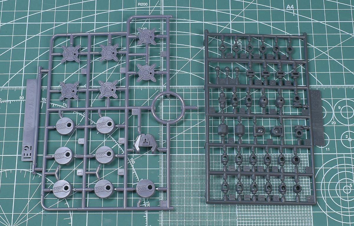 ↑E1、E2ランナー、ポリキャップ(PC-001)。E1とE2はパープルグレー成形色で、胴体部や膝部パーツ、チェーン・マイン(展開状態、収納状態)パーツ。KPS素材です。