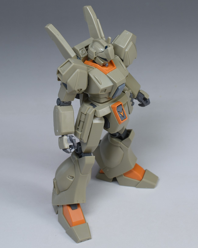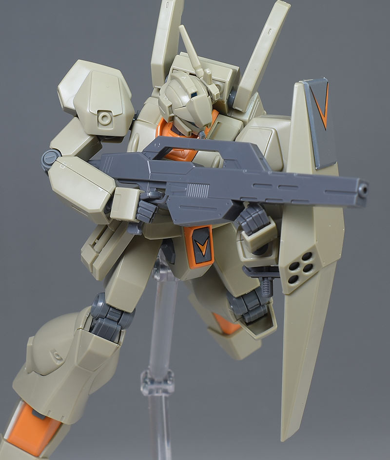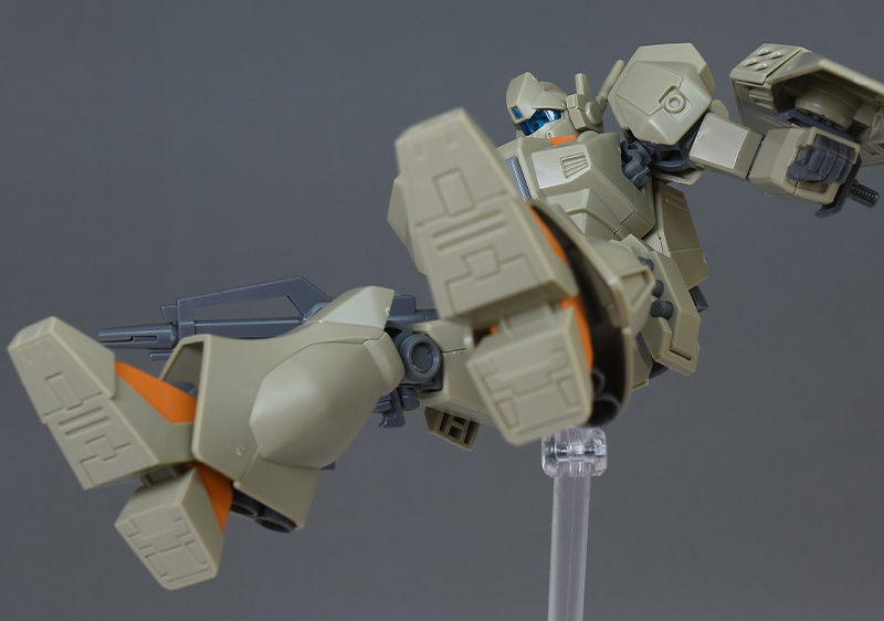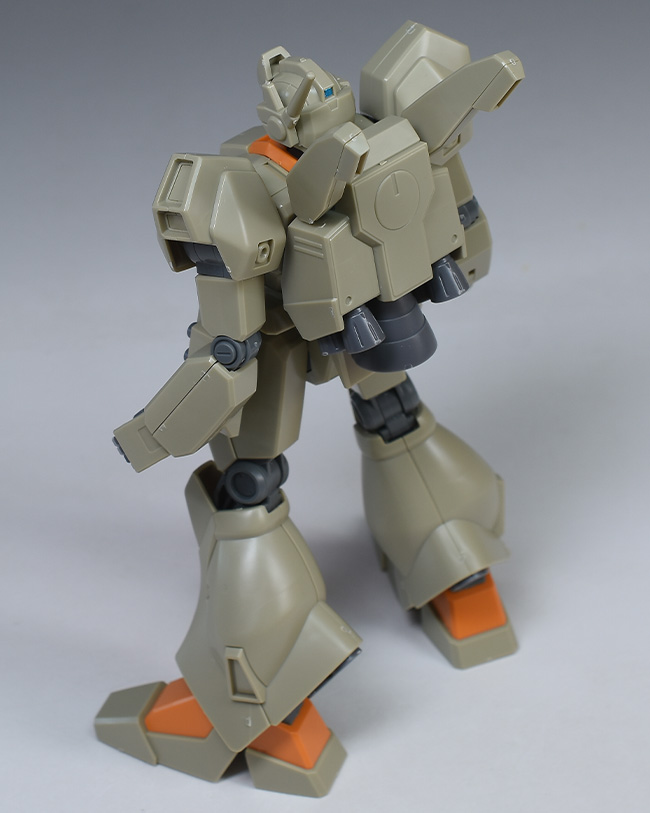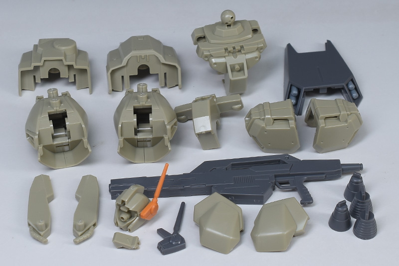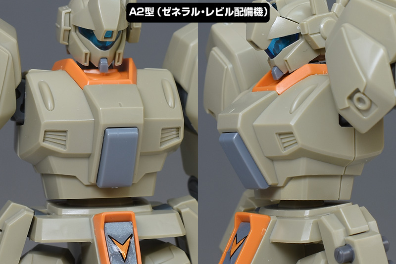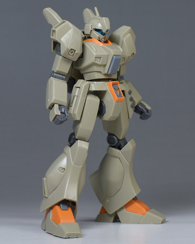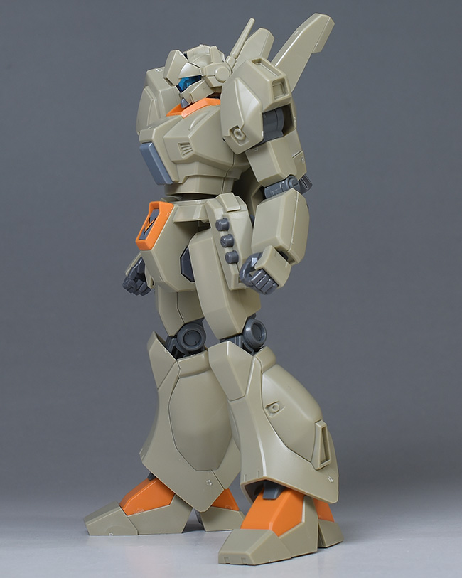 成形色はベージュを基調に、襟元や腰部、脚甲にオレンジを配色。その他、顎や腹部がライトグレー、内部や関節、武装類がグレー成型色での再現となっています。ゼネラル・レビル所属機らしいミリタリー調のカラーリング。