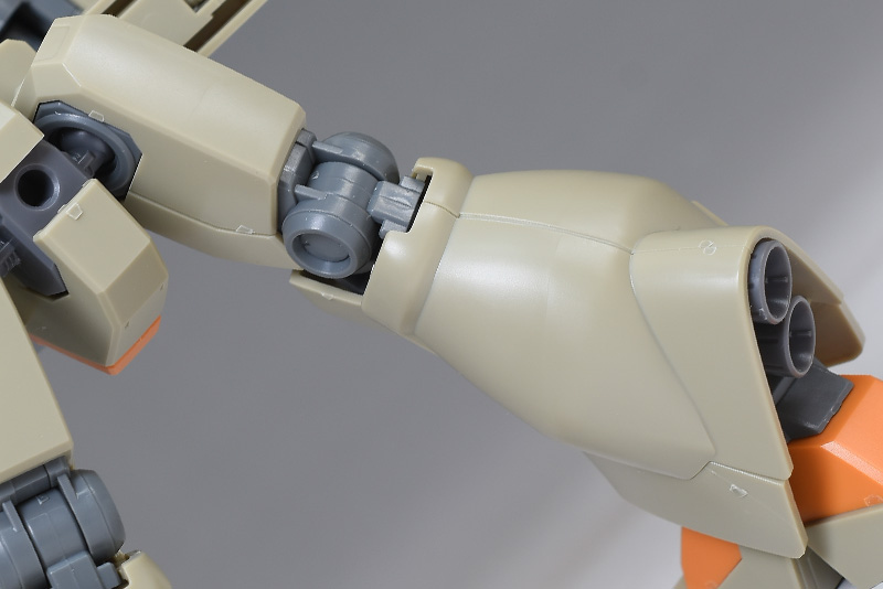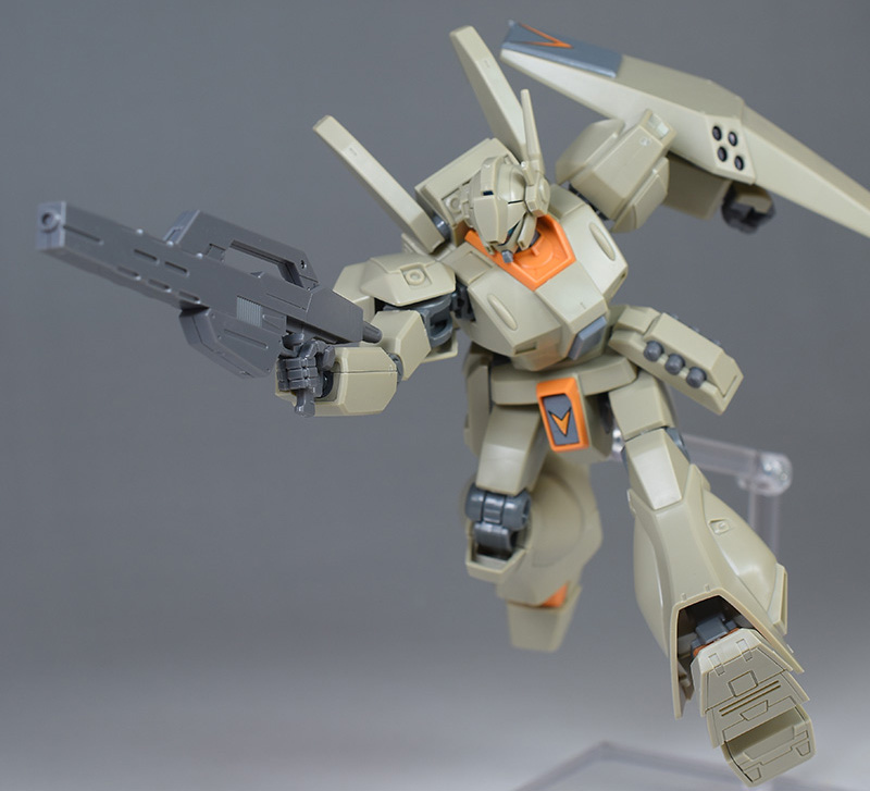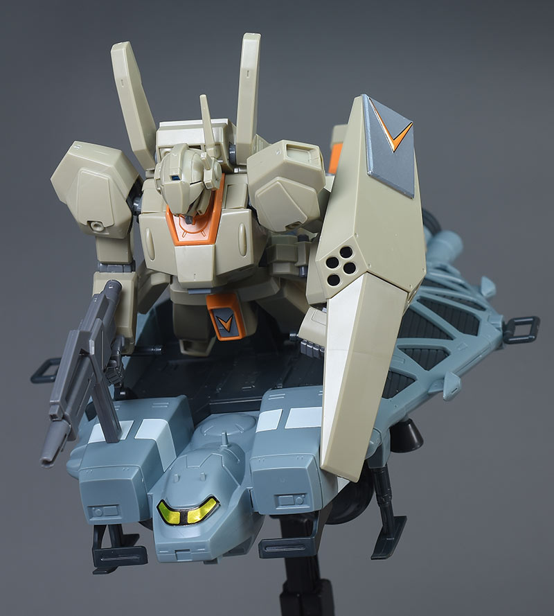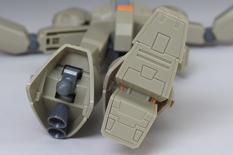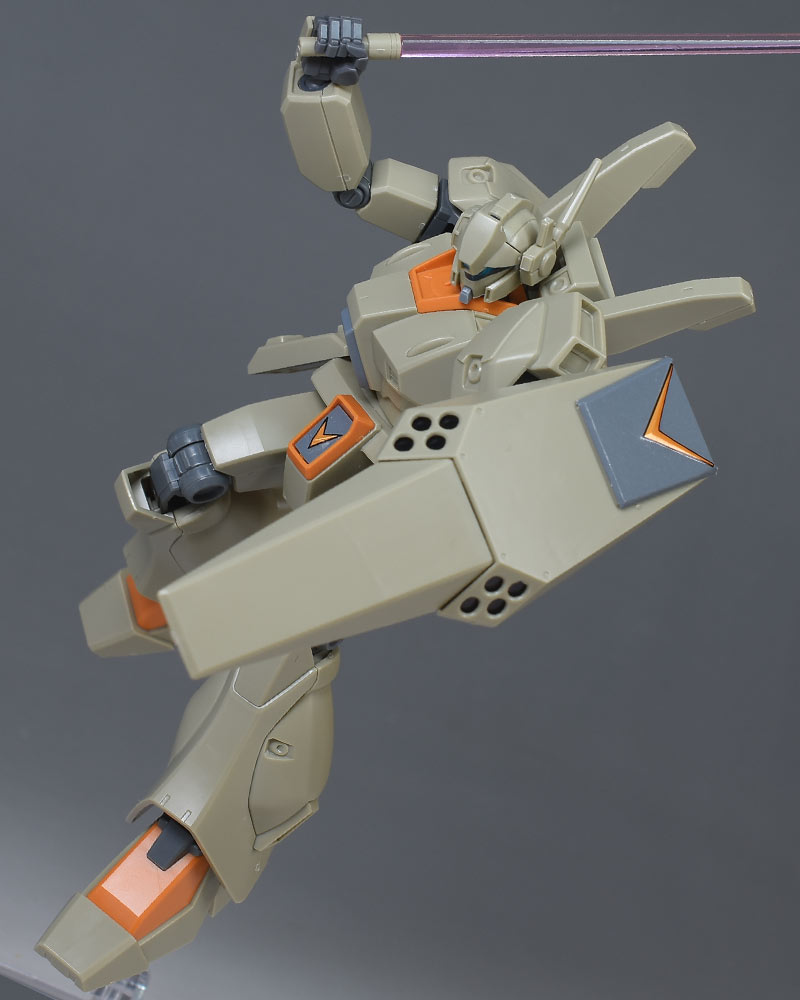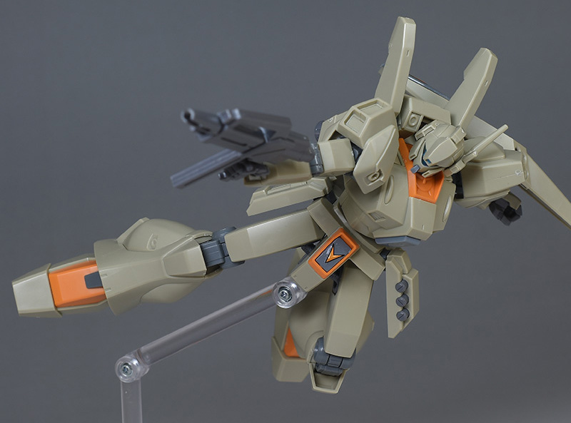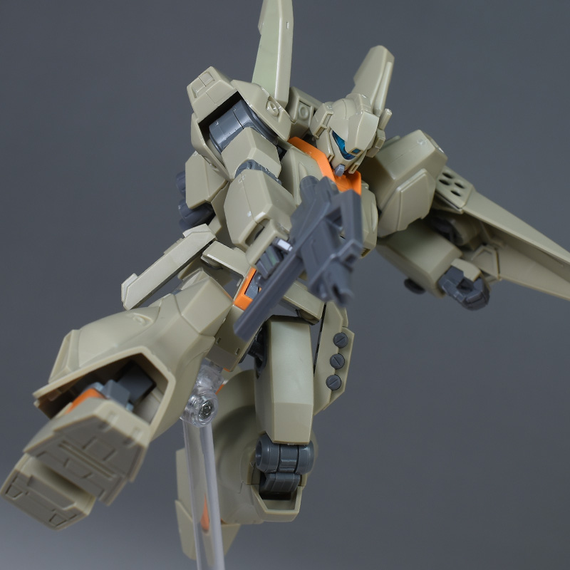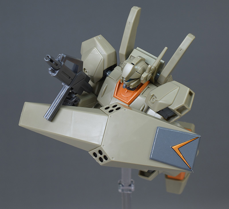 成形色はベージュを基調に、襟元や腰部、脚甲にオレンジを配色。その他、顎や腹部がライトグレー、内部や関節、武装類がグレー成型色での再現となっています。ゼネラル・レビル所属機らしいミリタリー調のカラーリング。