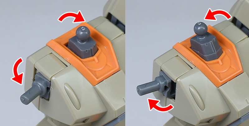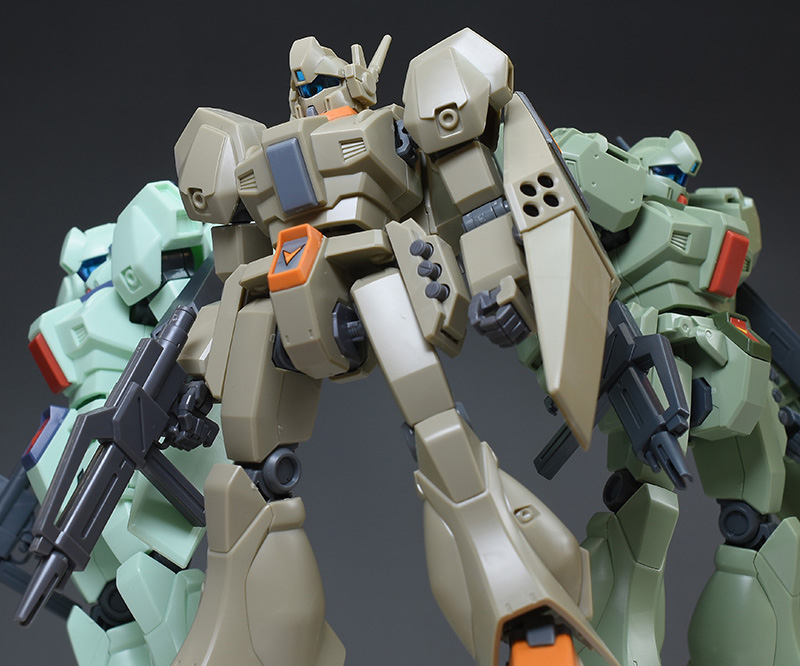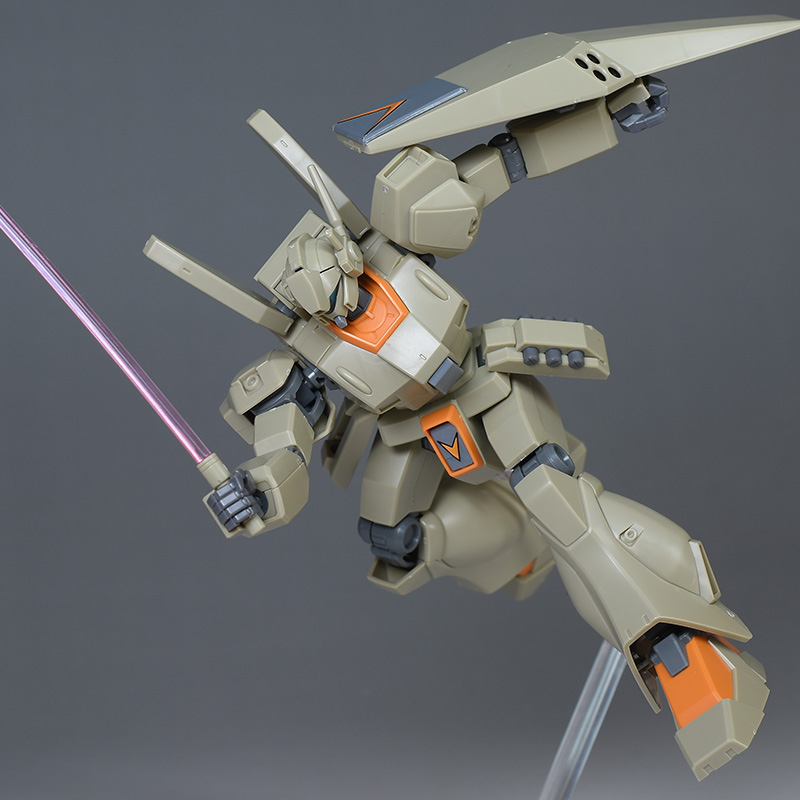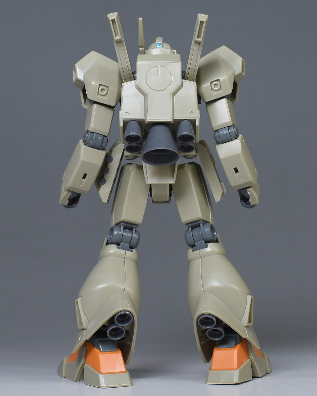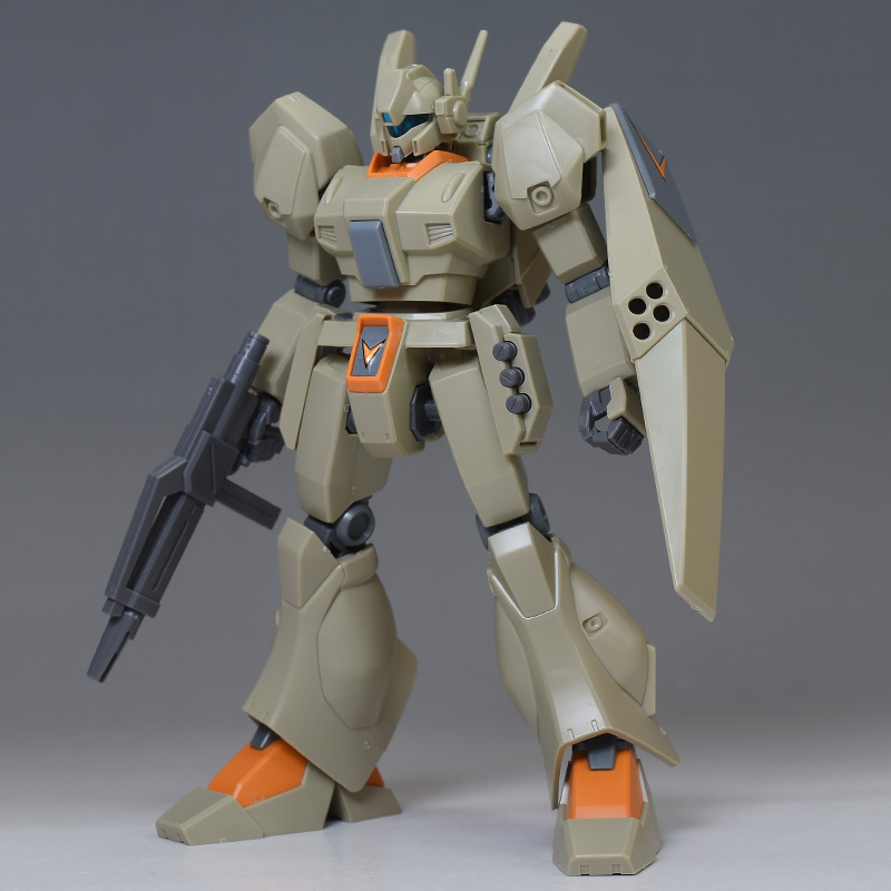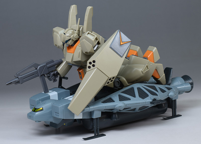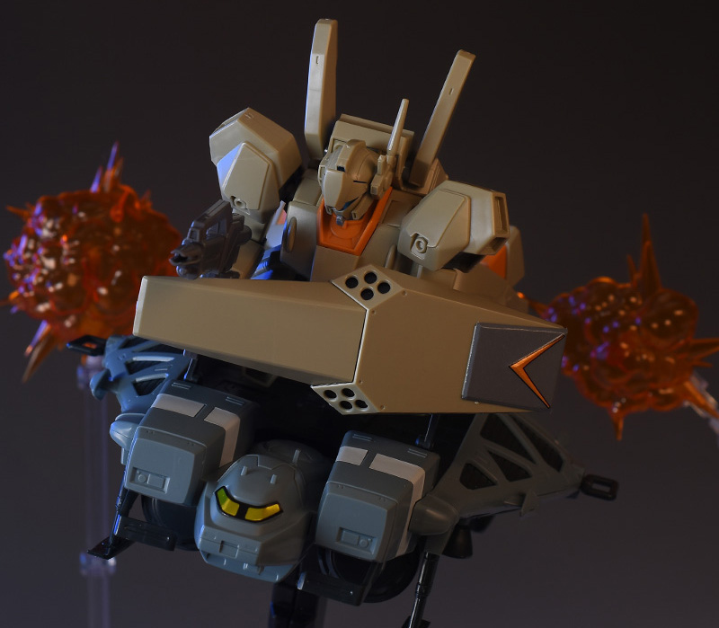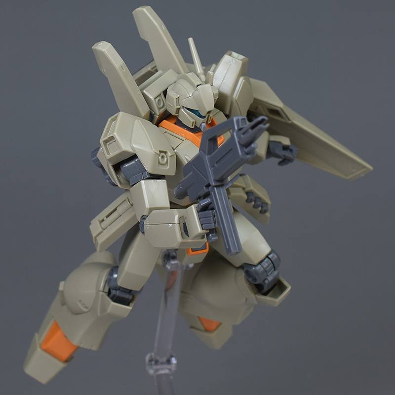 成形色はベージュを基調に、襟元や腰部、脚甲にオレンジを配色。その他、顎や腹部がライトグレー、内部や関節、武装類がグレー成型色での再現となっています。ゼネラル・レビル所属機らしいミリタリー調のカラーリング。