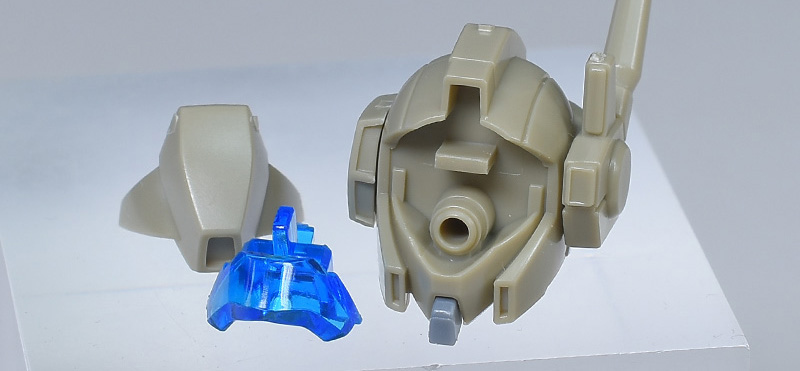 バルカンポッドは全体をグレーに塗り分けが必要。メット部は合わせ目ができないパーツ構成。額と後頭部センサーはD型と同様、ブルーのシールで色分けします。