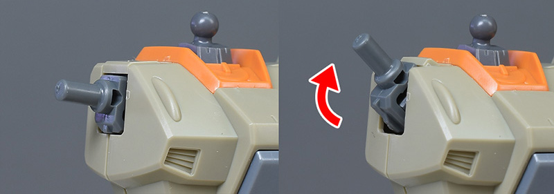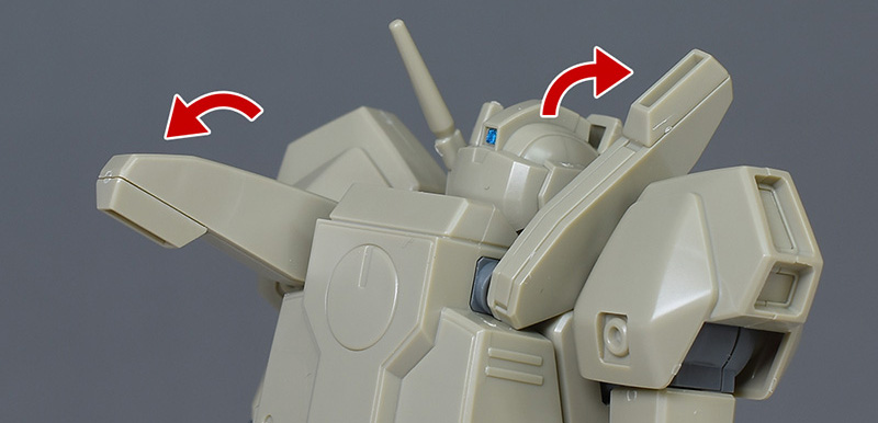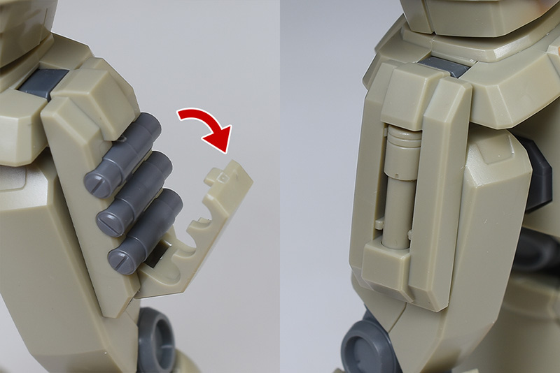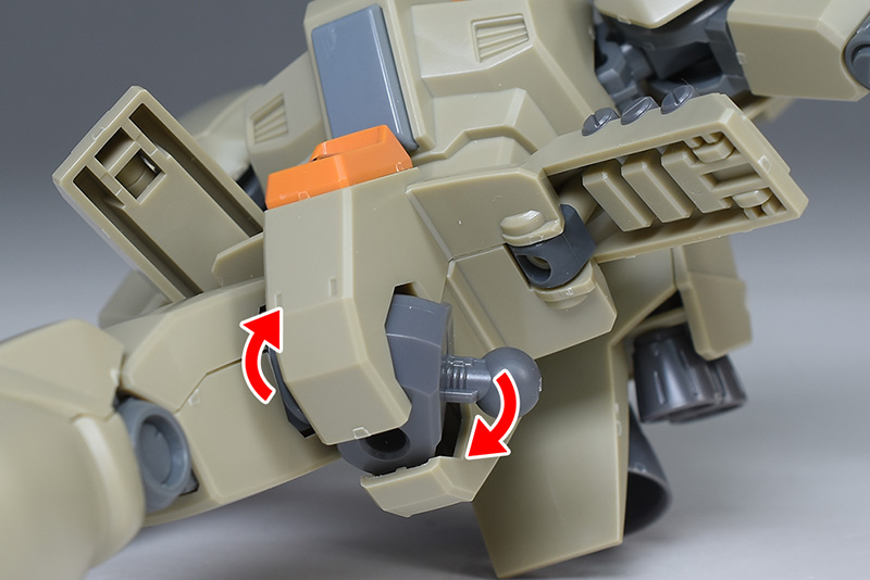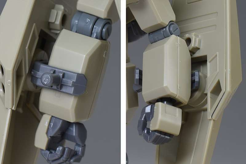 シールドも他のジェガンと同様、付属のジョイントパーツを前腕に組み付けて装備します。ジョイントパーツの位置を組み替えれば、側面と後方に配置が可能。お好みで選択することができます。組み換えもラク。
